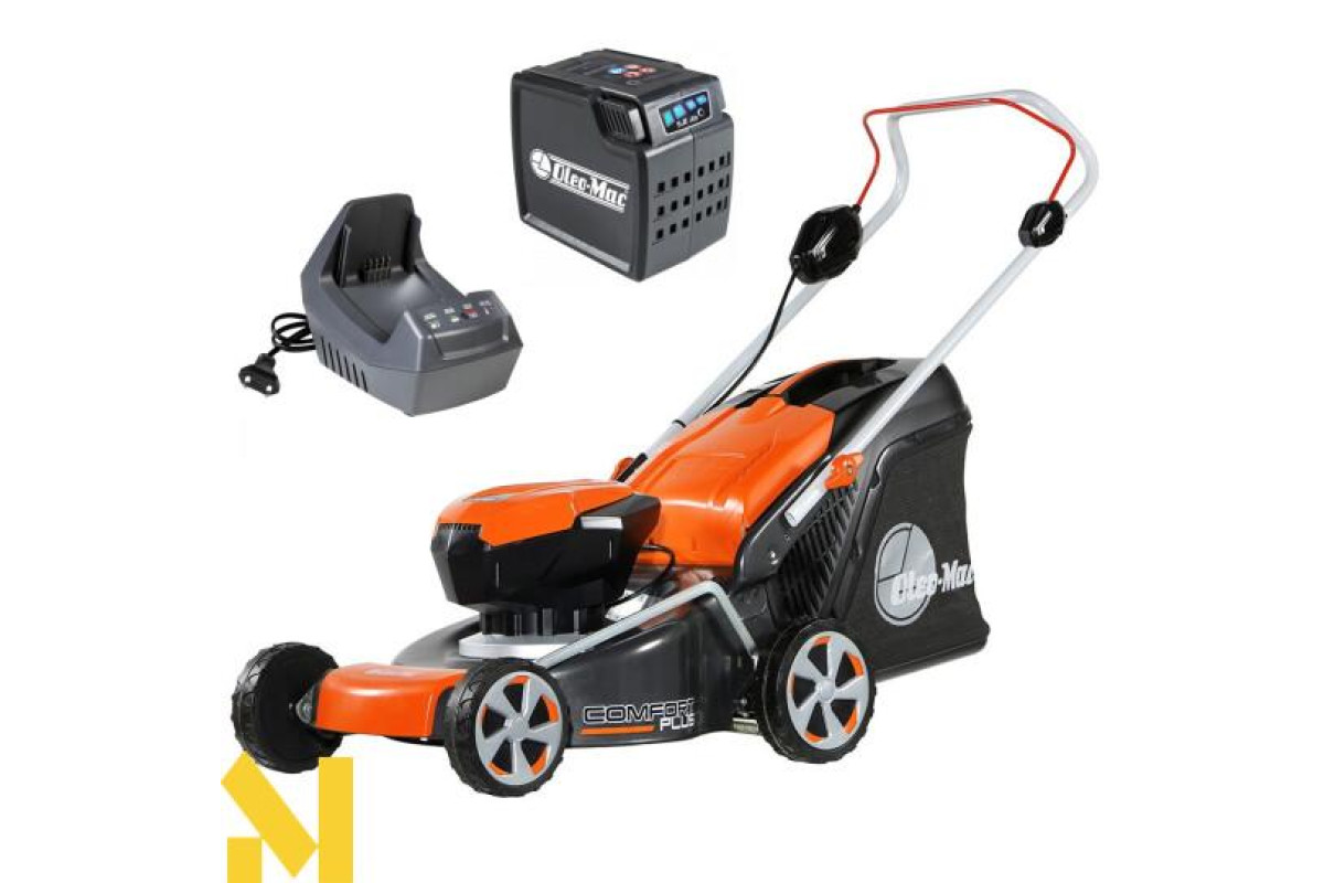 Газонокосарка Oleo-Mac Gi 44 P - джерелом живлення є акумуляторні батареї, забезпечуючи якісний покіс газонної трави. Акумуляторний двигун встановлений на металеву деку. Газонна косарка розрахована на покриття площі до 8 соток і висотою скошування трави від 28 до 75 см. Ширина захоплення ножа становить 41 см, ніж встановлений металевий на пряму від двигуна, дозволяє зменшити втрати потужності.