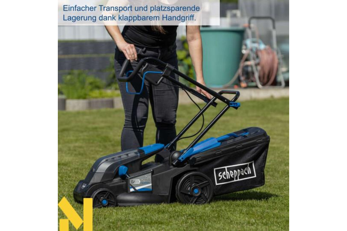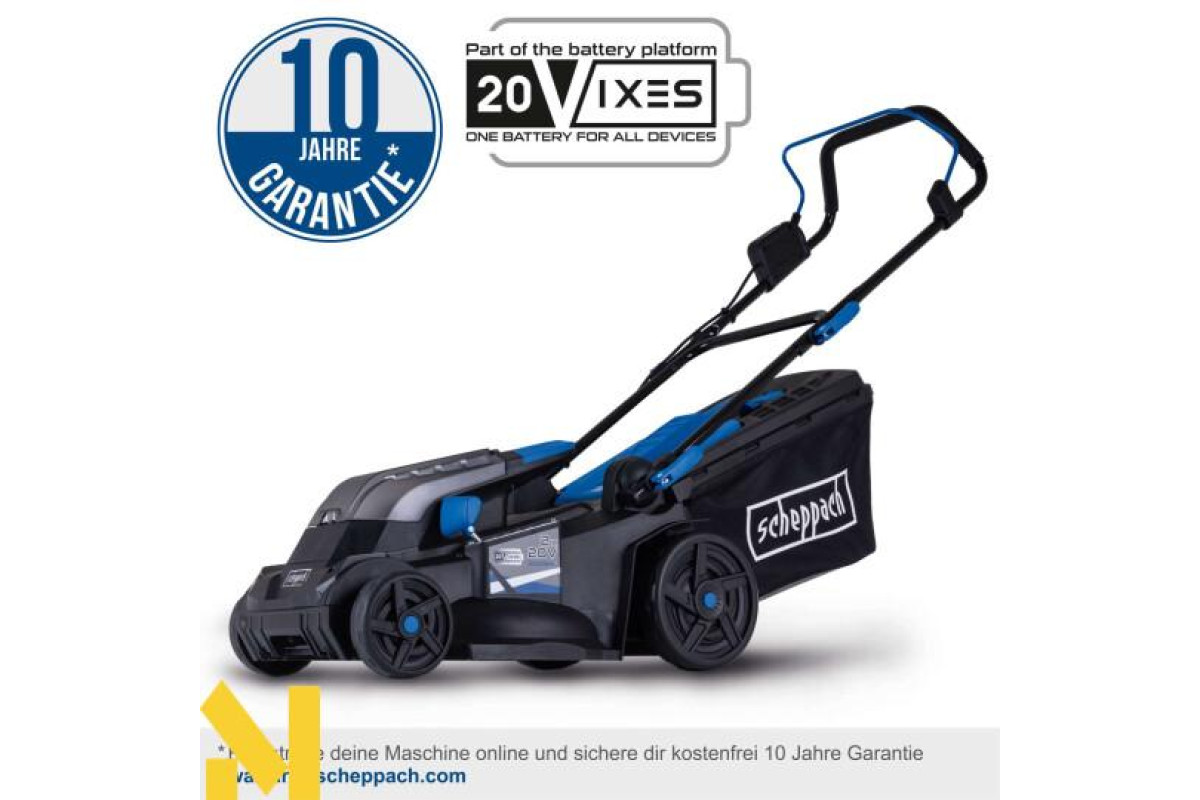 Бездротова робота з 20-вольтовою серією Scheppach IXES – усі акумулятори та зарядні пристрої системної серії можна комбінувати з бездротовою газонокосаркою