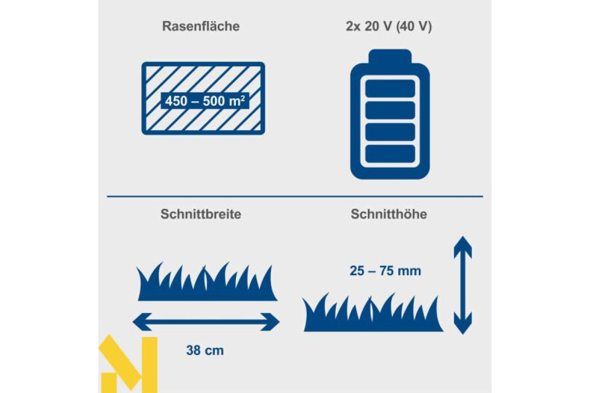 Акумуляторна газонокосарка Scheppach BC-MP380-X із шириною скошування 38 см підходить для садів площею від 450 до 500 м². Центральне регулювання висоти скошування з 6 налаштуваннями від 25 до 75 мм та двосторонній обрізувач країв газону забезпечують оптимальні результати. BC-MP380-X оснащена потужним безщітковим двигуном. Цей безщітковий двигун забезпечує особливо високу ефективність, довший час роботи, тривалий термін служби та знижений знос. Як частина серії Scheppach IXES 20 вольт, усі акумулятори та зарядні пристрої системи можна комбінувати з газонокосаркою. BC-MP380-X постачається з мульчувальною вставкою.