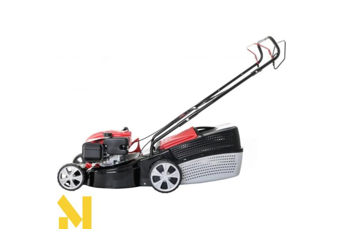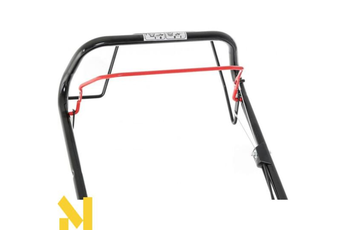 Детальна продуманість торкнулася форми і конструкції ручки. Основна робоча рукоятка може складатися, що економить місце при зберіганні агрегату і при його перевезенні. Висота ручки піддається регулюванню, підлаштовується під зріст оператора. Надійне кріплення зафіксує вибране положення. На ручці знаходяться прогумовані накладки, які забезпечують впевнене захоплення. Всі важелі управління знаходяться тут же, під рукою у оператора. Вони включають в себе важіль приводу на колеса, важіль включення обертання ножа, основну ручку запуску газонокосарки.