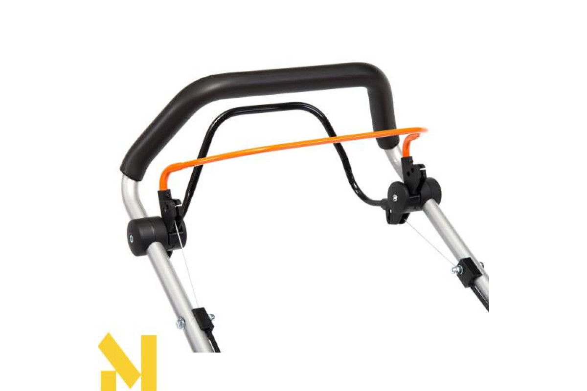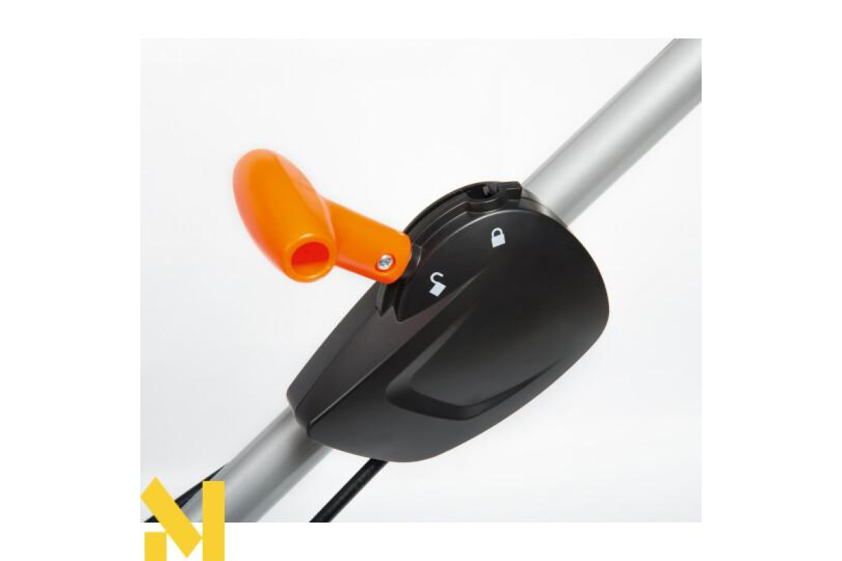 Рукоятка з антивібраційними накладками простим рухом складається і розміщується вздовж корпусу газонокосарки для забезпечення компактного зберігання або транспортування.