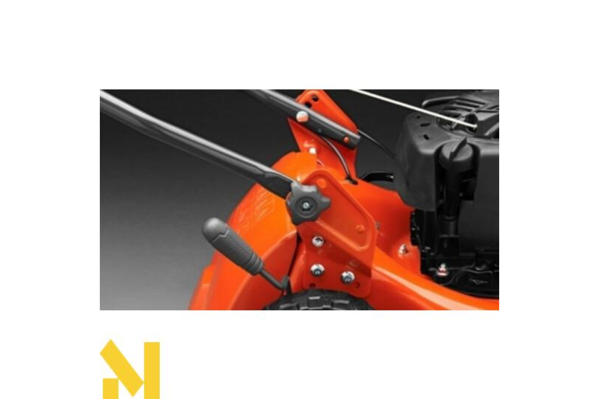 - Складна рукоятка для спрощення зберігання і транспортування. Коли рукоятка зафіксована в складеному положенні, оператор може підняти і перенести газонокосарку за рукоятку.