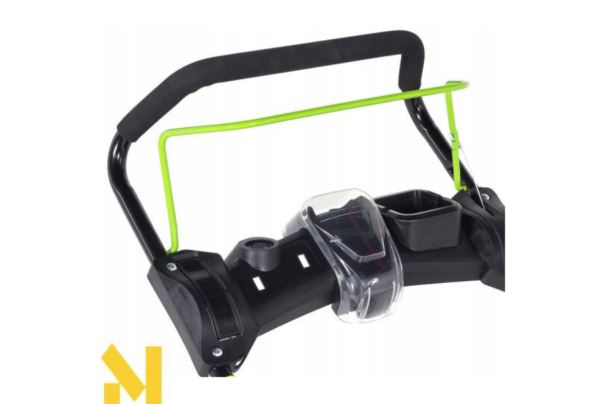 Ергономічні ручки газонокосарки мають м'яку обробку, що підвищує комфорт. Під ручкою розташована функціональна панель, куди можна покласти напій чи ключі. Ручка має пряжки для швидкого складання ручки.