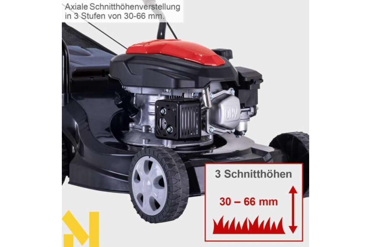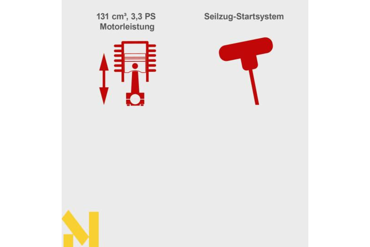 Газонокосарка легко запускається за допомогою пускового механізму. Потужний 4-тактний бензиновий двигун потужністю 2,4 кВт/3,3 к.с. з об'ємом 131 куб. см забезпечує швидке виконання роботи.