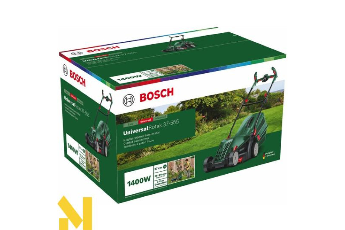 Bosch UniversalRotak 37-555 – зручна побутова газонокосарка для догляду за травою на середніх ділянках. Модель оснащена електромотором 1400 Вт, який живиться від мережі 230 В. Ширина захвату становить 37 см, є можливість регулювання висоти скошування в межах 25-70 мм. Пластиковий травозбірник має об'єм 40 л.