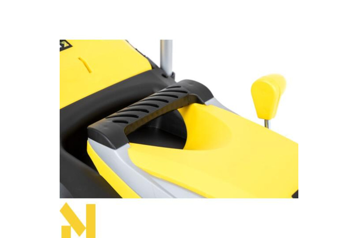 Зручний пристрій для косіння газону також оснащений зручною дворучною рукояткою з подвійним перемикачем, що дозволяє комфортно працювати з втомленими руками. Крім того, обладнання має практичну робочу ширину 43 см, що дозволяє дістатися навіть до дуже важкодоступних місць. Комфортне використання косарки забезпечують суцільні колеса і місткий кошик (50 л) з міцного пластику. Для безпеки прилад оснащений захистом від теплових перевантажень.