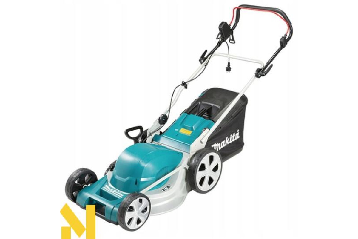 Газонокосарка Makita ELM4620 з живленням від мережі 220 В для ділянок до 8 соток. Складна конструкція, потужність 1,8 кВт, заглушка для мульчування і травозбірник в комплекті поставки.