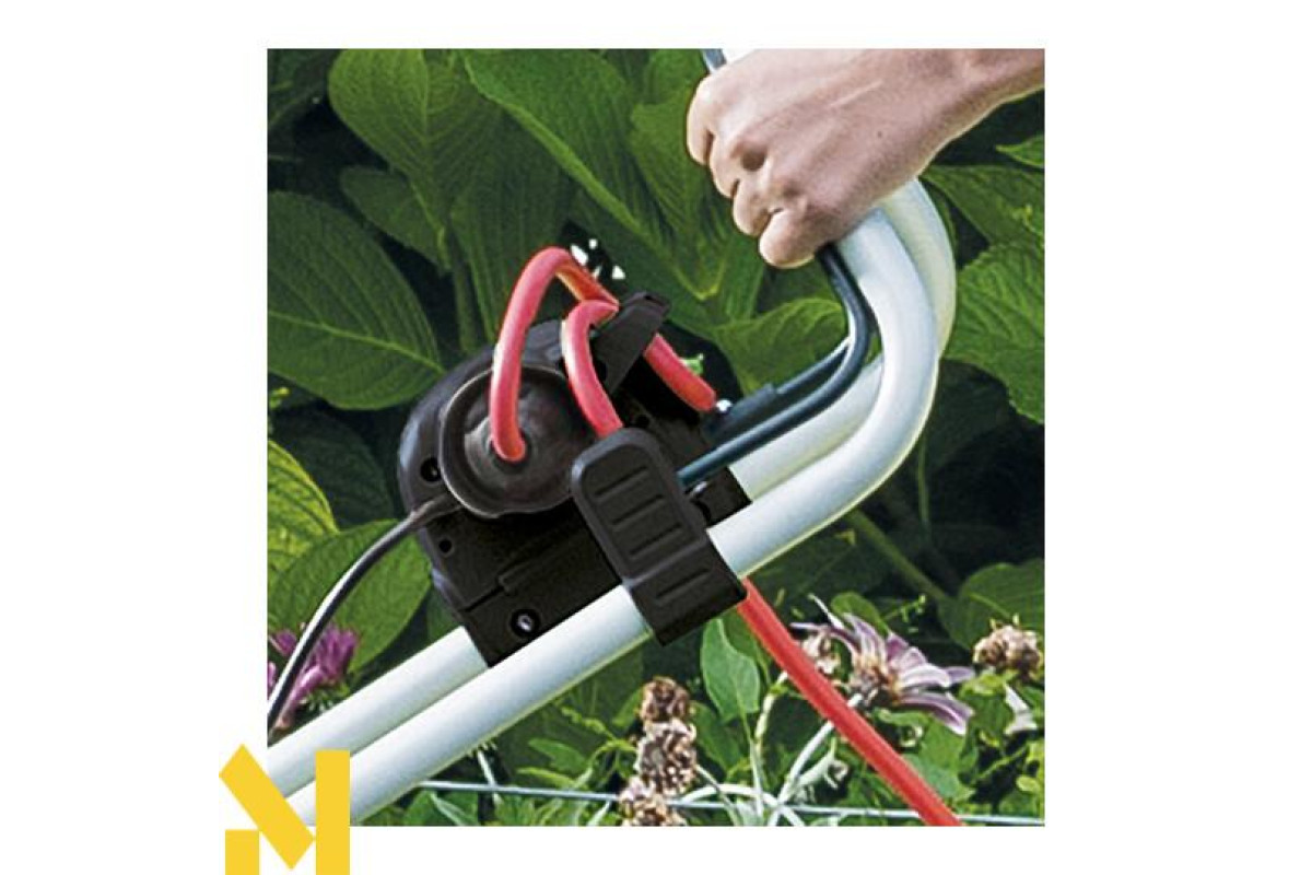 Вбудоване пристосування для розвантаження мережевого кабелю від натягнення надійно фіксує подовжуючий кабель на панелі з вимикачами і роз'ємами електрокосарки STIHL.