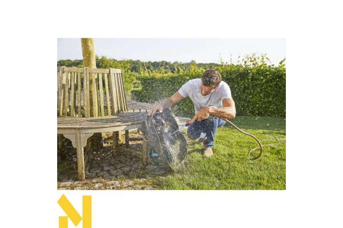 Gardena Gardena SILENO life побудована так, що просте обприскування садовим шлангом ретельно звільняє корпус, леза та колеса від бруду, пилу та залишків трави.