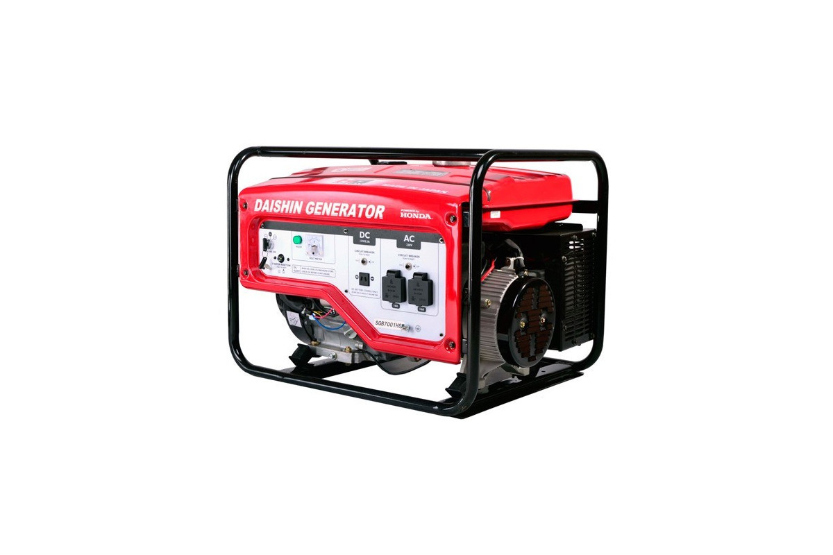 Призначення генератора Daishin SGB 7001HSAГенератор Daishin SGB7001HSA може бути резервним джерелом електричного струму для забезпечення електроенергією заміського будинку, ремонтної бригади, будівництва і т.д.Генератор може забезпечити електроживлення газового котла (0,5 кВт), холодильника (0,7 кВт), пральної машини (1 кВт), посудомийної машини (1,2 кВт) і т. д.