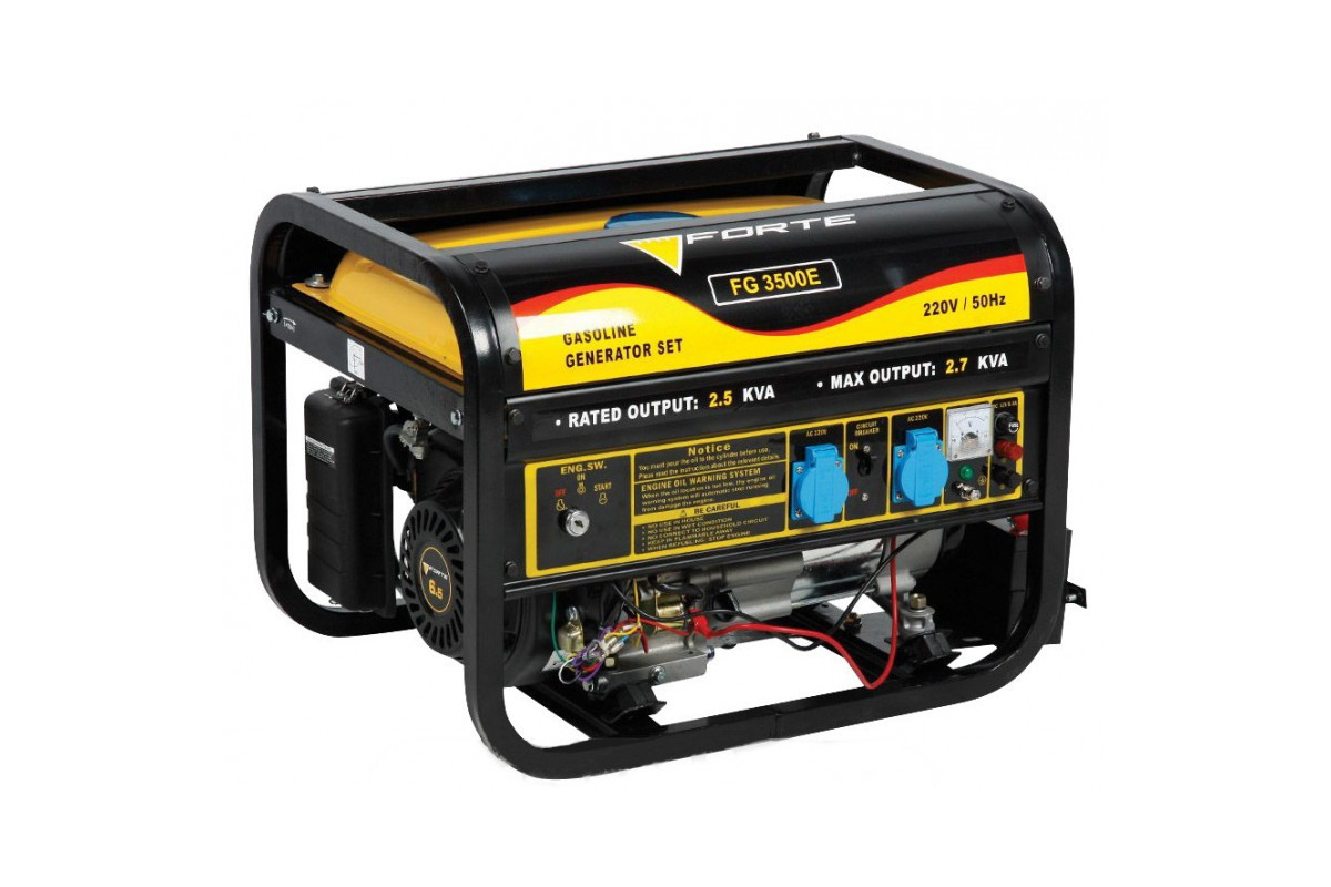 Призначення генератора Forte FG 3500ЕГенератор Forte FG3500Е може бути резервним джерелом електричного струму для забезпечення електроенергією заміського будинку, ремонтної бригади, будівництва і т.д.Генератор може забезпечити електроживлення газового котла (0,5 кВт), холодильника (0,7 кВт), пральної машини (1 кВт), посудомийної машини (1,2 кВт) і т. д.