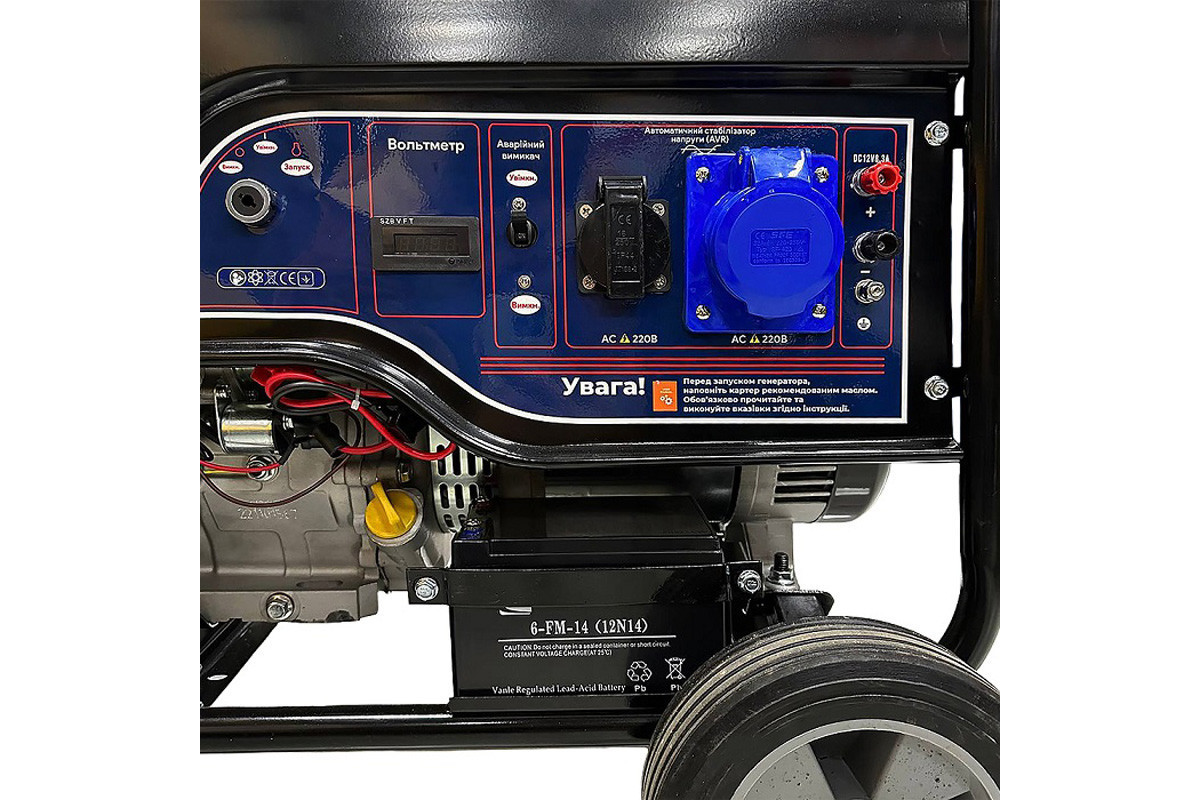 ![]() | Панель управління: інтуїтивно проста, доступна недосвідченому користувачеві. На ній виведені: кнопка запуску генератора, основні індикатори роботи (вольтметр, лічильник відпрацьованого часу (мотогодини)), розетки - 2 шт (16 А та 32 А), АВР - автоматичний регулятор напруги, клеми на 12В для зарядки акумуляторів, запобіжник на розетки, заземлення. |