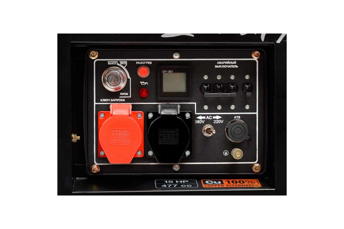 - AVR: автоматичний регулятор напруги гарантує роботу генератора без перевантажень і не допускає появи стрибків напруги.