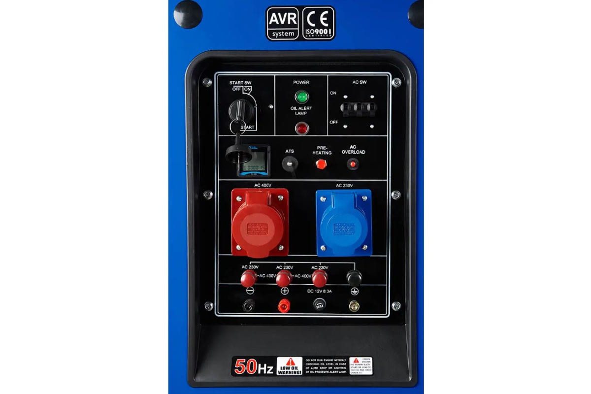 ![]() | Панель управління: інтуїтивно проста, доступна недосвідченому користувачеві. На ній виведені: кнопка запуску генератора, основнi показники роботи (мультиметр), розетки - 2 шт, клеми на 12В для зарядки акумуляторів, АВР - автоматичний регулятор напруги, запобіжник на розетки, заземлення. |
