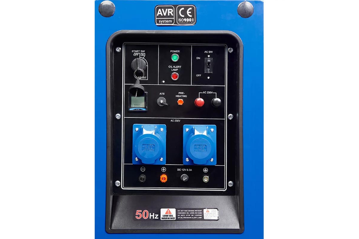 ![]() | Панель управління: інтуїтивно проста, доступна недосвідченому користувачеві. На ній виведені: кнопка запуску генератора, основнi показники роботи (мультиметр), розетки - 2 шт, клеми на 12В для зарядки акумуляторів, АВР - автоматичний регулятор напруги, запобіжник на розетки, заземлення. |