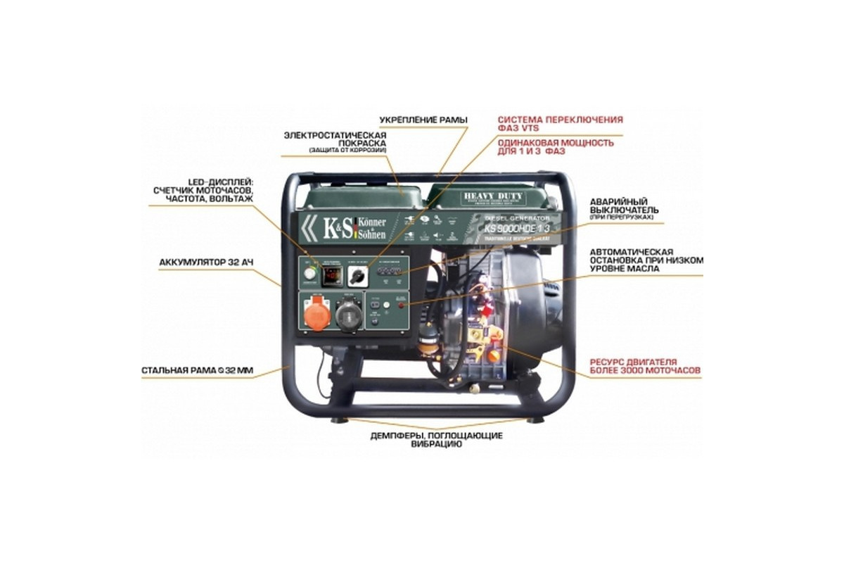 ![]() | Konner&Sohnen производства Германия. Ручной/электрический/автоматичний запуск. Оснащен датчиком контроля уровня масла. Экономичность: расход топлива составляет - 0,9 л/ч. Автоматический регулятор напряжения обеспечивает стабильность выходного напряжения независимо от нагрузки. Данная модель оснащена колесами и ручками, что позволяет легко перемещать генератор по Вашему участку или объекту. |
