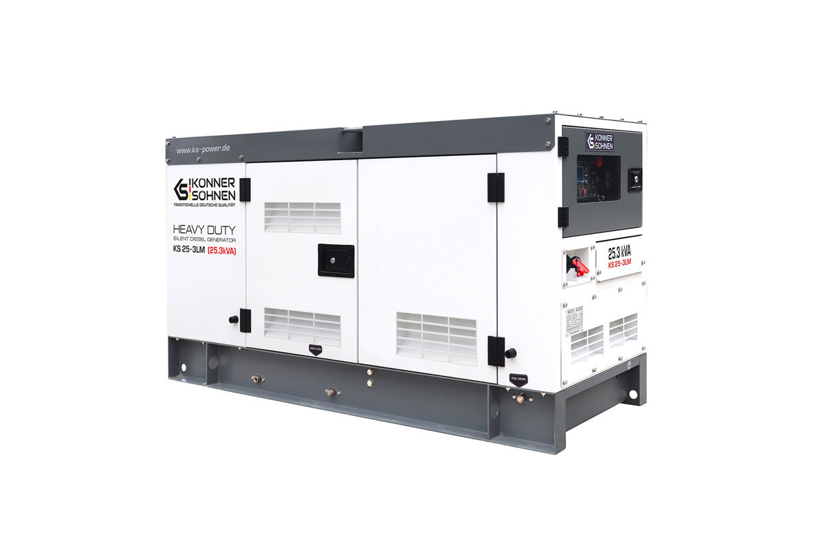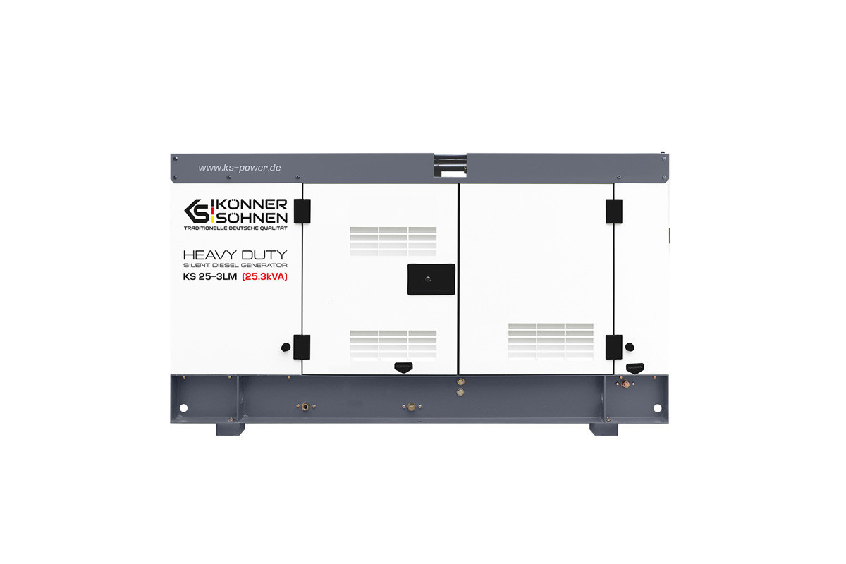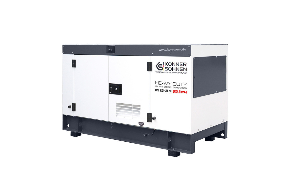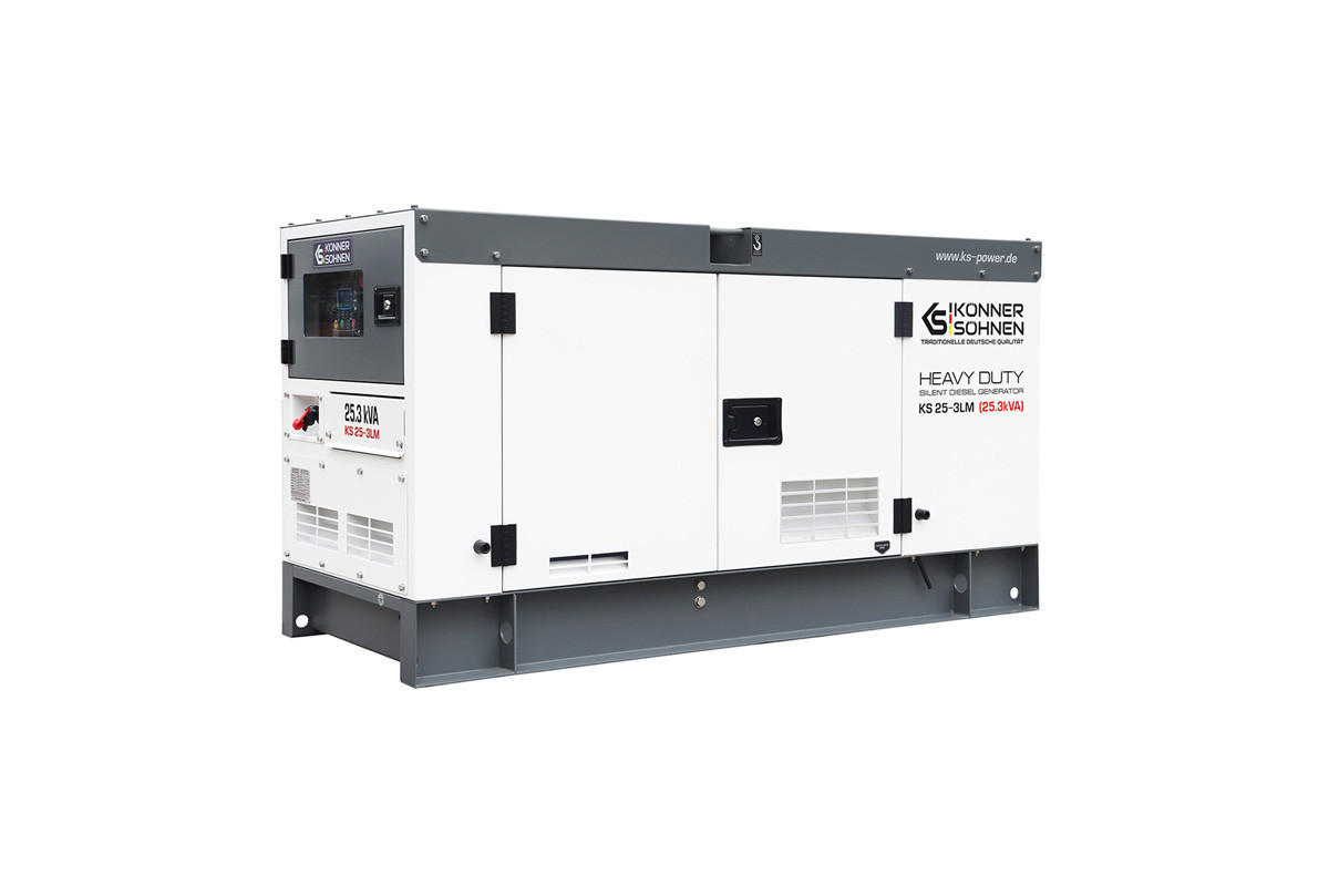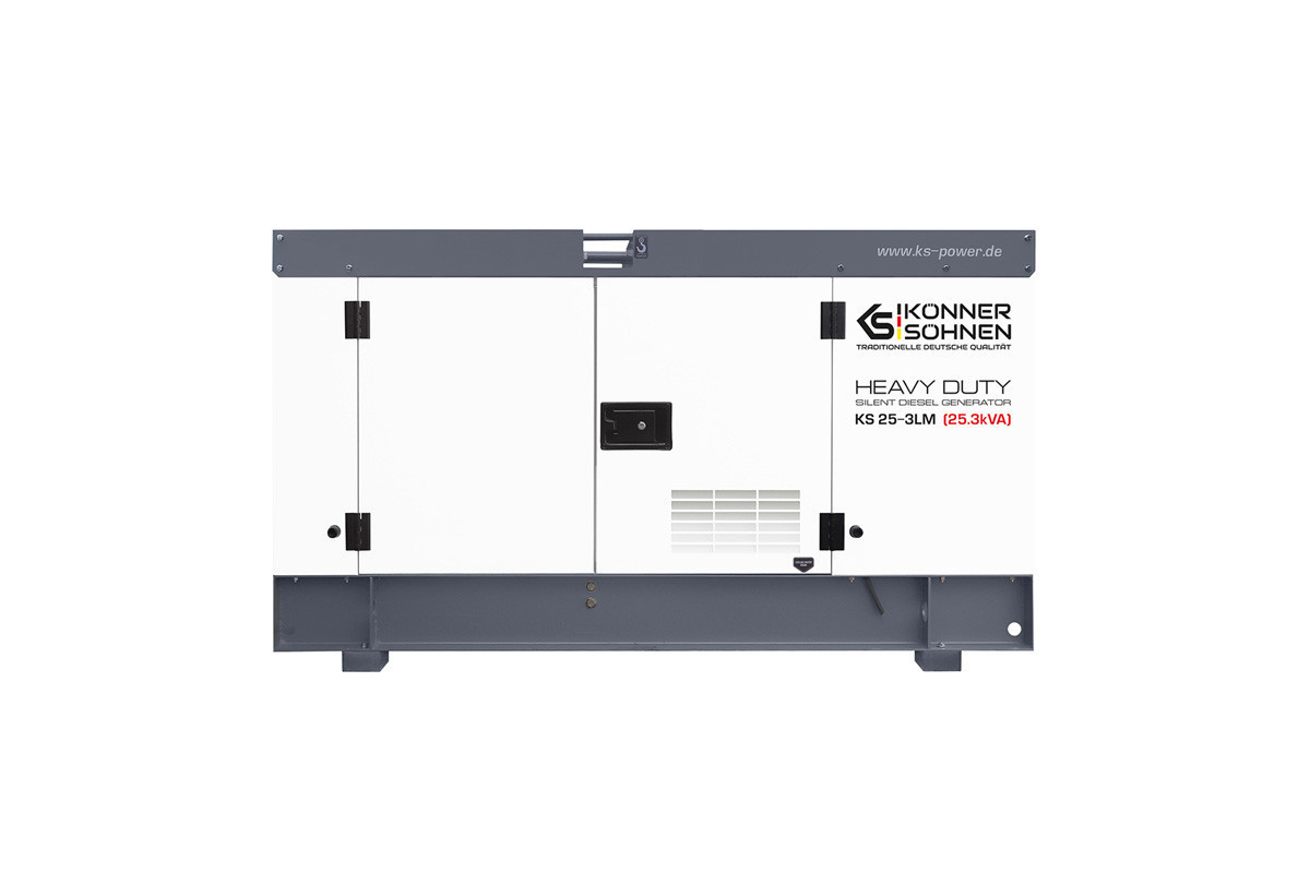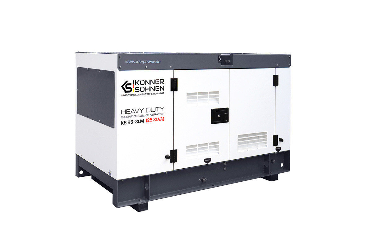 Модель стаціонарного генератора Konner&Sohnen KS 25-3LM, яка працює на дизпаливі, призначена для використання в якості резервного або основного джерела перемінного струму для забезпечення подачі електроенергії (лікарні, фабрики, виробничої лінії, заправочної станції, котельні, СТО), а також на будівництвах і в побутових потреб.Така електростанція може живити одразу декілька споживачів, сумарною кількістю 23 кВа: приватний будинок, дачу, офіс, магазин, будівельний майданчик, виробниче підприємство, і т.д.