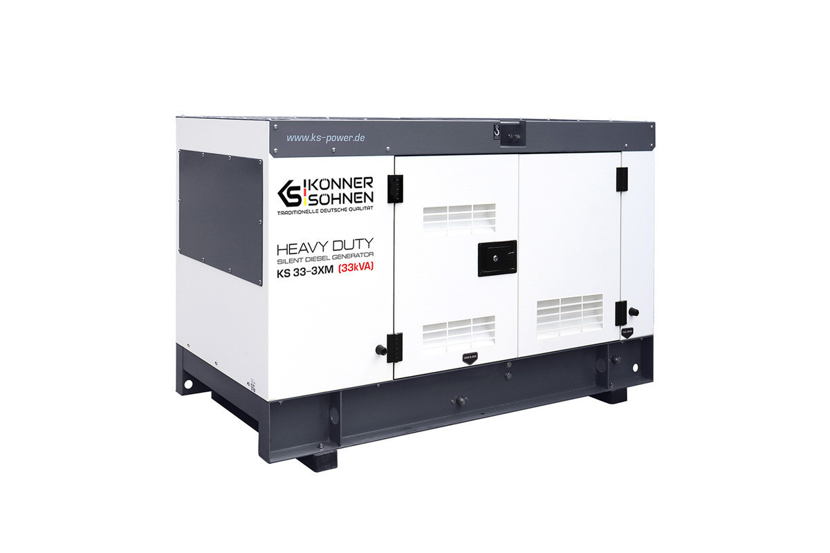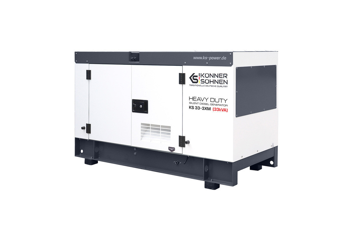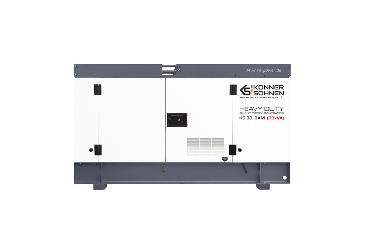 Модель стаціонарного генератора Konner&Sohnen KS 33-3XM, яка працює на дизпаливі, призначена для використання в якості резервного або основного джерела перемінного струму для забезпечення подачі електроенергії (лікарні, фабрики, виробничої лінії, заправочної станції, котельні, СТО), а також на будівництвах і в побутових потреб.Така електростанція може живити одразу декілька споживачів, сумарною кількістю 30 кВа: приватний будинок, дачу, офіс, магазин, будівельний майданчик, виробниче підприємство, і т.д.