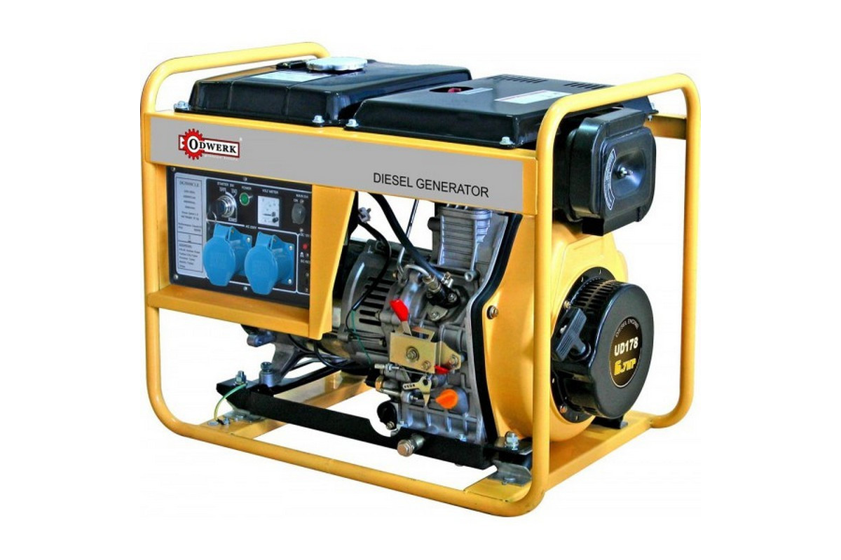 Призначення генератора Odwerk DG 3600EГенератор Odwerk DG3600E може бути резервним джерелом електричного струму для забезпечення електроенергією заміського будинку, ремонтної бригади, будівництва і т.д.Генератор може забезпечити електроживлення газового котла (0,5 кВт), холодильника (0,7 кВт), пральної машини (1 кВт), посудомийної машини (1,2 кВт), мікрохвильовій печі (0,9 кВт), масляного радіатора (2,2 кВт), інфрачервоного радіатора (2,2 кВт), телевізора (0,4 кВт), ноутбука (0,5 кВт), комп'ютера (0,5 кВт), освітлювальних приладів (0,5 кВт) і т. д.