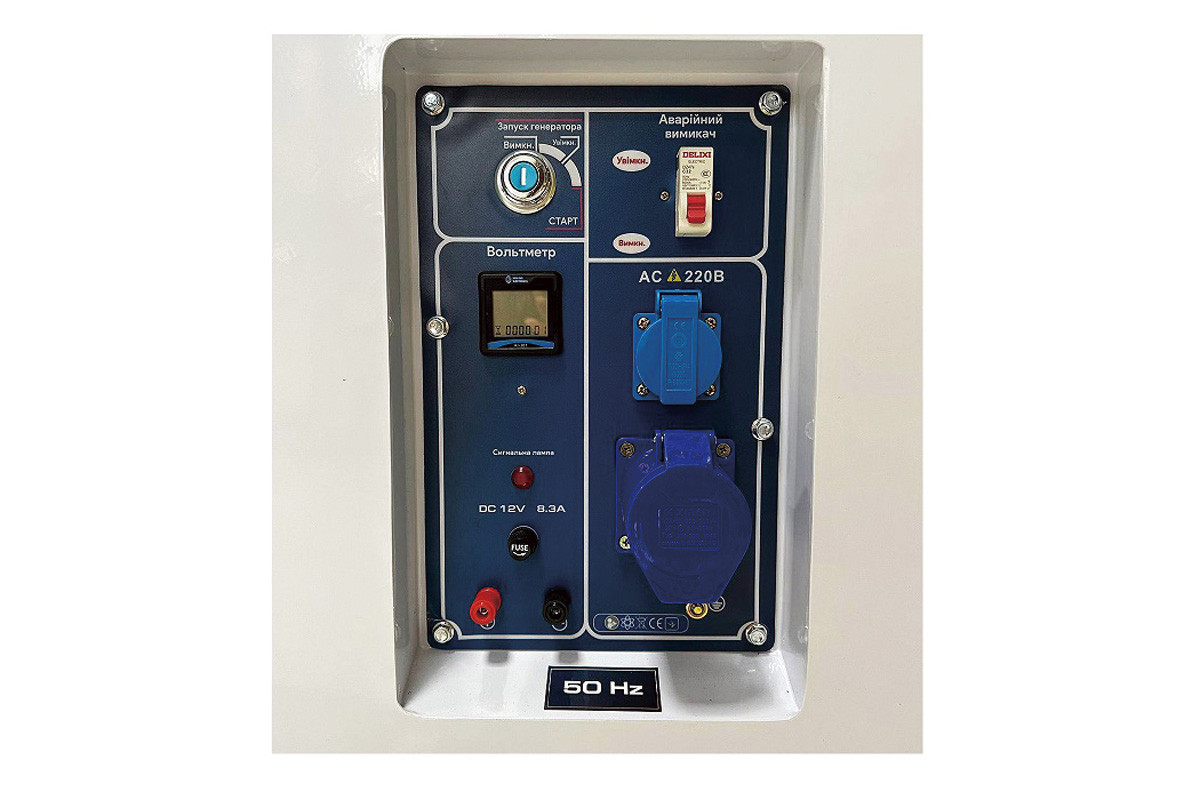 ![]() | Панель управління: інтуїтивно проста, доступна недосвідченому користувачеві. На ній виведені: кнопка запуску генератора, основні індикатори роботи (лічильник мотогодин), розетки 2 шт, АВР - автоматичний регулятор напруги, запобіжник на розетки, заземлення. |