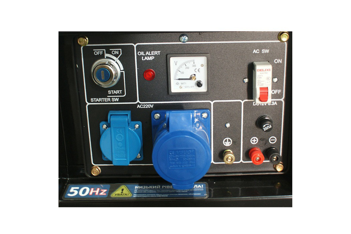 ![]() | Панель управління: інтуїтивно проста, доступна недосвідченому користувачеві. На ній виведені: кнопка запуску генератора, основні індикатори роботи (вольтметр), розетки 2 шт (16А та 32 А), клеми на 12В для зарядки акумуляторів, АВР - автоматичний регулятор напруги, запобіжник на розетки, заземлення. |