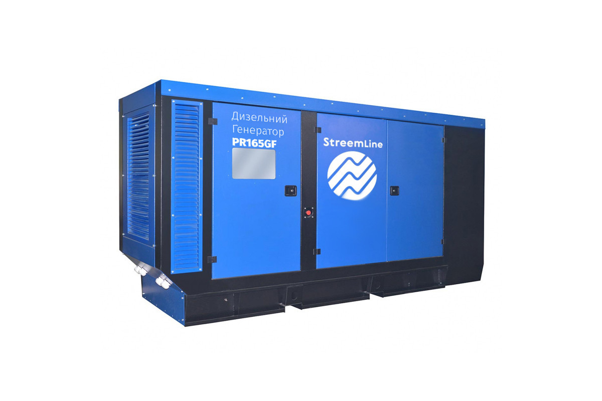 Модель стаціонарного генератора StreemLine PR165GF, яка працює на дизпаливі, призначена для використання в якості резервного або основного джерела перемінного струму для забезпечення подачі електроенергії (лікарні, фабрики, виробничої лінії, заправочної станції, котельні, СТО), а також на будівництвах і в побутових потреб.