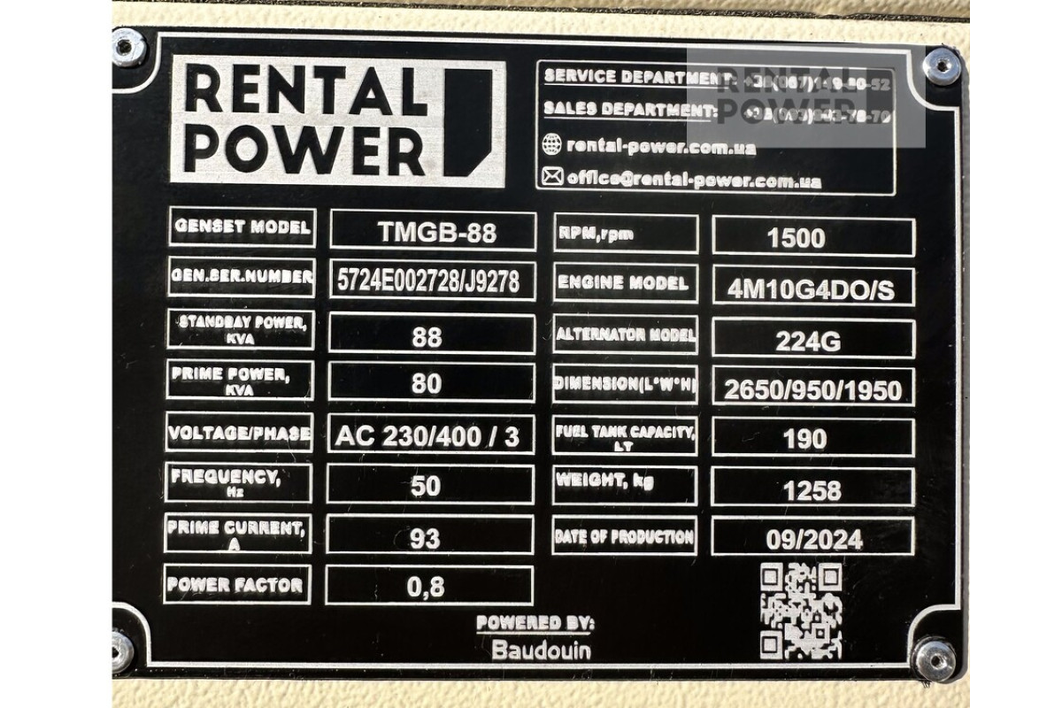 Дизельний генератор TMG Power TMGB-88 (64кВт) на базі двигуна Baudouin 4M10G88/5 як для постійної, так і для резервної роботи. Дизельні електростанції серії TMGB (нізкошумних виконання) володіють однією з найбільш тихих і захищених кожухів. Кожуха мають високу утеплення і мають посилене кріплення, за рахунок чого кожух не підлягає зняттю з електростанції.