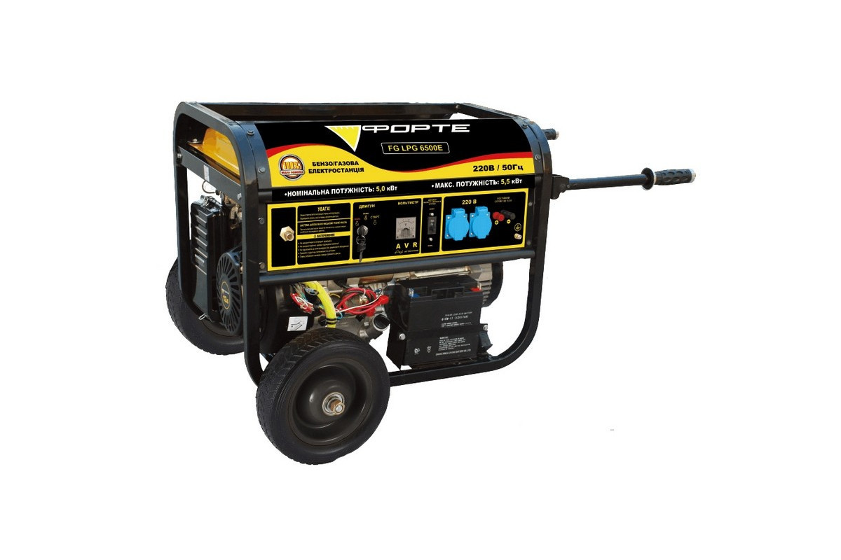 Призначення генератора Forte FG LPG-6500Е:Генератор Forte FG LPG-6500Е може бути резервним джерелом електричного струму для забезпечення електроенергією заміського будинку, ремонтної бригади, будівництва і т.д.Генератор може забезпечити електроживлення газового котла (0,5 кВт), холодильника (0,7 кВт), пральної машини (1 кВт), посудомийної машини (1,2 кВт), мiкрохвильовiй печi (0,9 кВт), масляного радiатора (2,2 кВт) і т. д.
