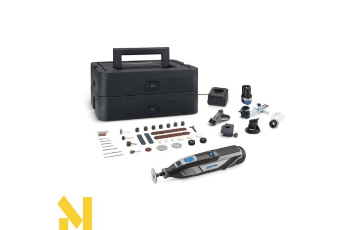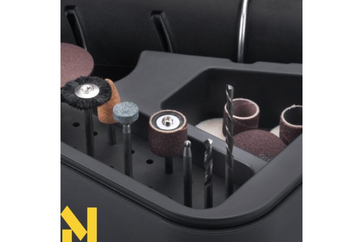 Для виконання різання, шліфування, полірування, гравіювання, фрезерування, свердління та інших завдань використовуються 5 насадок і 65 аксесуарів, акуратно розміщених в коробці Dremel з регульованими перегородками для індивідуального зберігання.