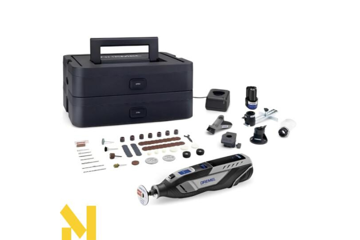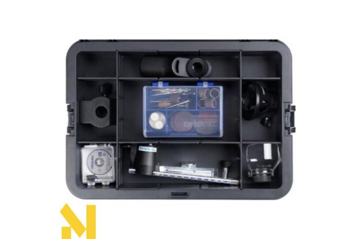 Для виконання різання, шліфування, полірування, гравіювання, фрезерування, свердління та інших завдань використовуються 5 насадок і 65 аксесуарів, акуратно розміщених в коробці Dremel з регульованими перегородками для індивідуального зберігання.
