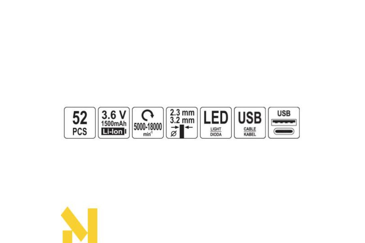 Зручний інструмент дозволяє точно обробляти різні матеріали. Завдяки літій-іонному акумулятору напругою 4 В та ємністю 1,5 Ач він забезпечує тривалий час роботи. Швидке заряджання за 2 години за допомогою зарядного пристрою USB-C. Міні-шліфувальна машина має 5 налаштувань швидкості від 5000 до 18000 об/хв, що дозволяє регулювати швидкість під конкретні завдання.