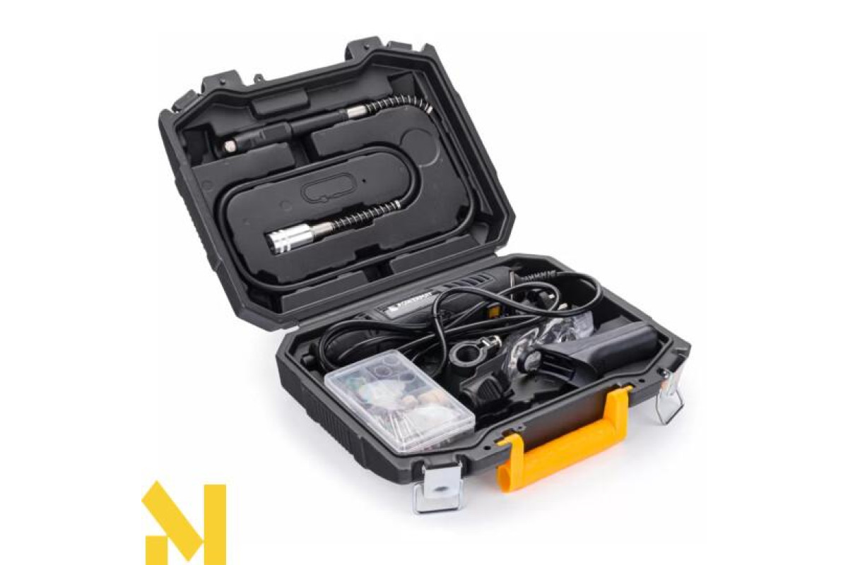 За допомогою багатофункціональної шліфувальної машини та набору приладдя можна свердлити, шліфувати та зачищати. Міні-прецизійна шліфувальна машина оснащена насадкою (швидкоз'ємне з'єднання), до якої можна приєднувати різні насадки. Крім того, мультишліфувальна машина має гнучке з'єднання довжиною 107 см, що особливо корисно при роботі у важкодоступних місцях. Блокувальна кнопка дозволяє швидко змінювати насадки. Спеціально посилений кільцевий затиск гарантує надійне закріплення насадок. Регулювання частоти обертання дозволяє адаптувати робочу швидкість до типу оброблюваного матеріалу. Міні-шліфувальна машина є ідеальним інструментом для використання в наступних майстернях: шліфування, гравірування, полірування, фрезерування та ювелірні роботи, виготовлення моделей, хобі. Міні-шліфувальна машина має зручну ручку та допоміжну ручку зі світлодіодним підсвічуванням, завдяки якій ви можете легко повісити шліфувальну машину в зручному місці. До набору входить ряд компонентів, щоб ви могли підібрати необхідну насадку для виконання конкретної роботи. Все в практичному кейсі для зберігання.