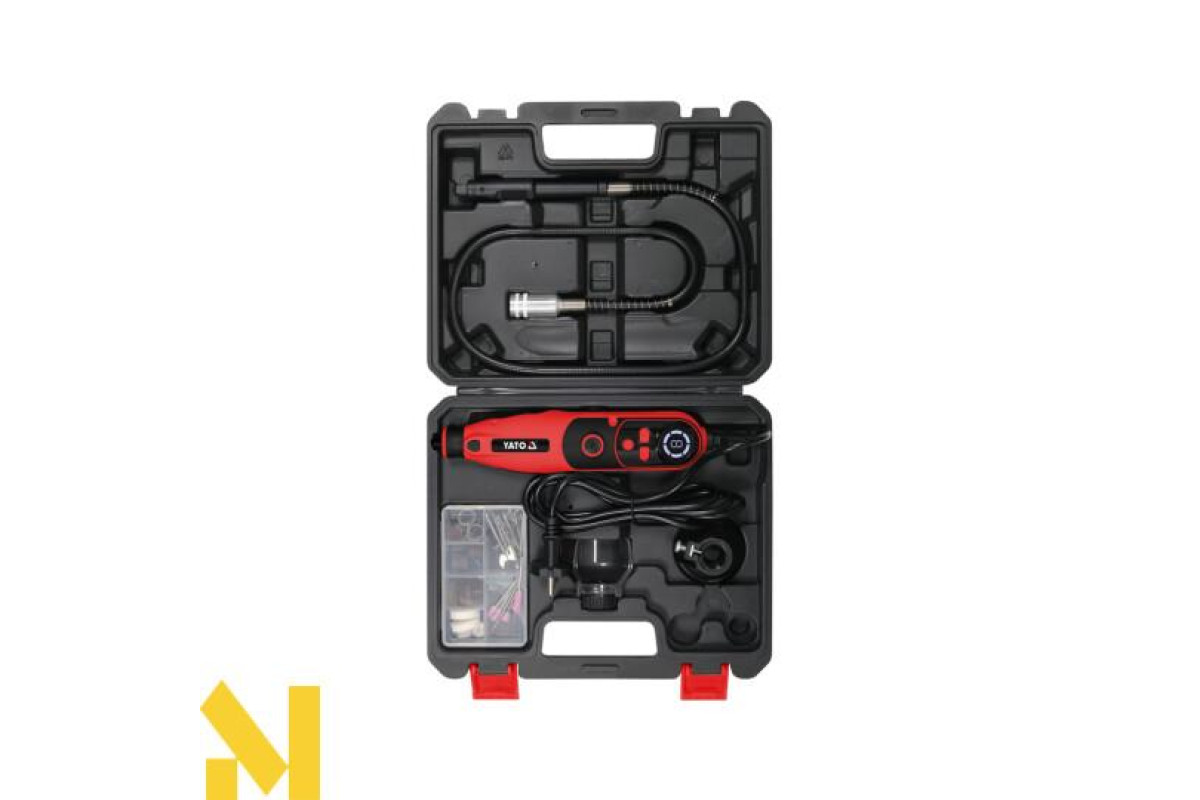 Зручний інструмент з живленням від мережі, який дозволяє точно обробляти різні матеріали. Використовується для свердління, шліфування, фрезерування, гравірування, полірування та очищення. Має 6 налаштувань швидкості від 10 000 до 35 000 обертів на хвилину, що дозволяє регулювати швидкість під конкретні завдання. Швидкість обертання регулюється електронікою. Тримач інструменту самоцентруючий. Світлодіодне освітлення полегшує виконання точних завдань. Потужність 130 Вт. У комплекті з міні-шліфувальною машиною є додатковий інструментотримач на гнучкій стрілі, ключ для кріплення інструментотримача, захисний кожух, фіксатор шпинделя стріли, фрезерна насадка і 82 абразивних аксесуара.
