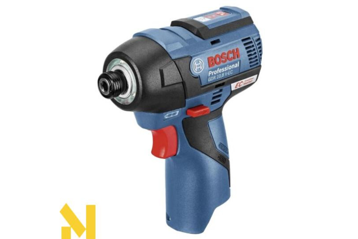Опис Bosch GDR 10,8 V-EC Professional: Невеликий, двошвидкісний (0-1200 / 0-2600 об/хв) гайковерт Bosch GDR 10,8 V-EC з високим крутним моментом 110 Нм при роботі в жорстких матеріалах, здатний затягувати і відпускати гайки, загвинчувати і відгвинчувати гвинти і шурупи діаметром 8 мм. Для роботи підходять гвинти з метричною різьбою М4-М12. Працює з ударом 0-2700 уд / хв на 1-й швидкості, 0-3100 уд/хв на 2-й. Патрон з внутрішнім шестигранником ¼ дюйма. Зручний для роботи у важкодоступних місцях. Компактний, легкий (0,9 кг) інструмент загвинчує і відгвинчує шурупи і гвинти діаметром 8 мм, з різьбленням М4-М12. Дві регульовані швидкості (0-1200 / 0-2600 об/хв), з налаштованим числом ударів (0-2700 / 0-3100 уд/хв) дають можливість контролювати потужність гайковерта і точно працювати з різними біт-насадками і матеріалами. Високий крутний момент 110 Нм дозволяє цьому невеликому інструменту запросто загвинчувати і відгвинчувати гвинти в жорсткі матеріали. Покращений ударний механізм, безщітковий ЄС двигун збільшують термін експлуатації інструменту на 100%. Поставляється в картонній упаковці, без акумулятора і зарядного пристрою. Технічні особливості акумуляторного ударного гайковерта Bosch GDR 10,8 V-EC Professional: