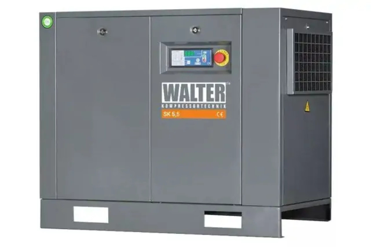 Гвинтовий компресор з ремінним приводом WALTER SK 5,5 SXP з продуктивністю 700 л/ хв при 10 Бар здатний тривалий час підтримувати стабільну роботу потужного пневматичного обладнання і відмінно підходить для промислового застосування. Працює від трифазної мережі 400 В.