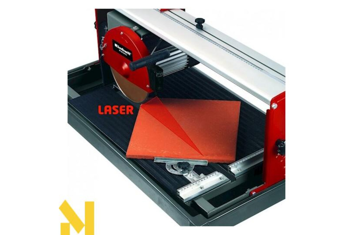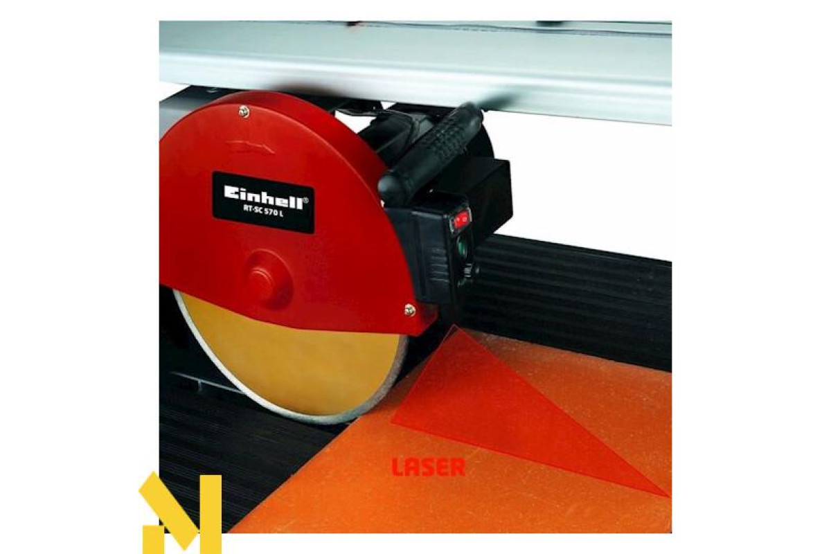 Каменеріз Einhell RT-SC 570 L - верстат для різання плит натурального і штучного каменю, бетону, цегли, каміння розміром до 57 см і товщиною до 65 мм. Каменерізний верстат Einhell RT-SC 570 L можна розглядати як стаціонарний, так і пересувний різак кам'яних плит, так як є стійка станина у вигляді великого робочого столу з гумовим килимком, але, при цьому складні ніжки дозволяють підготувати до транспортування і досить просто перевезти верстат Einhell RT-SC 570 L до нового місця використання. Каменеріз Einhell RT-SC 570 L виконує просту або подвійну похилу різання. Як пильної оснастки використовується алмазний ріжучий диск діаметром 250 мм, який під час пиляння охолоджує вбудований насос з рідиною. Легкознімний, що працює незалежно від верстата лазерний модуль точно вказує лінію майбутнього різу.