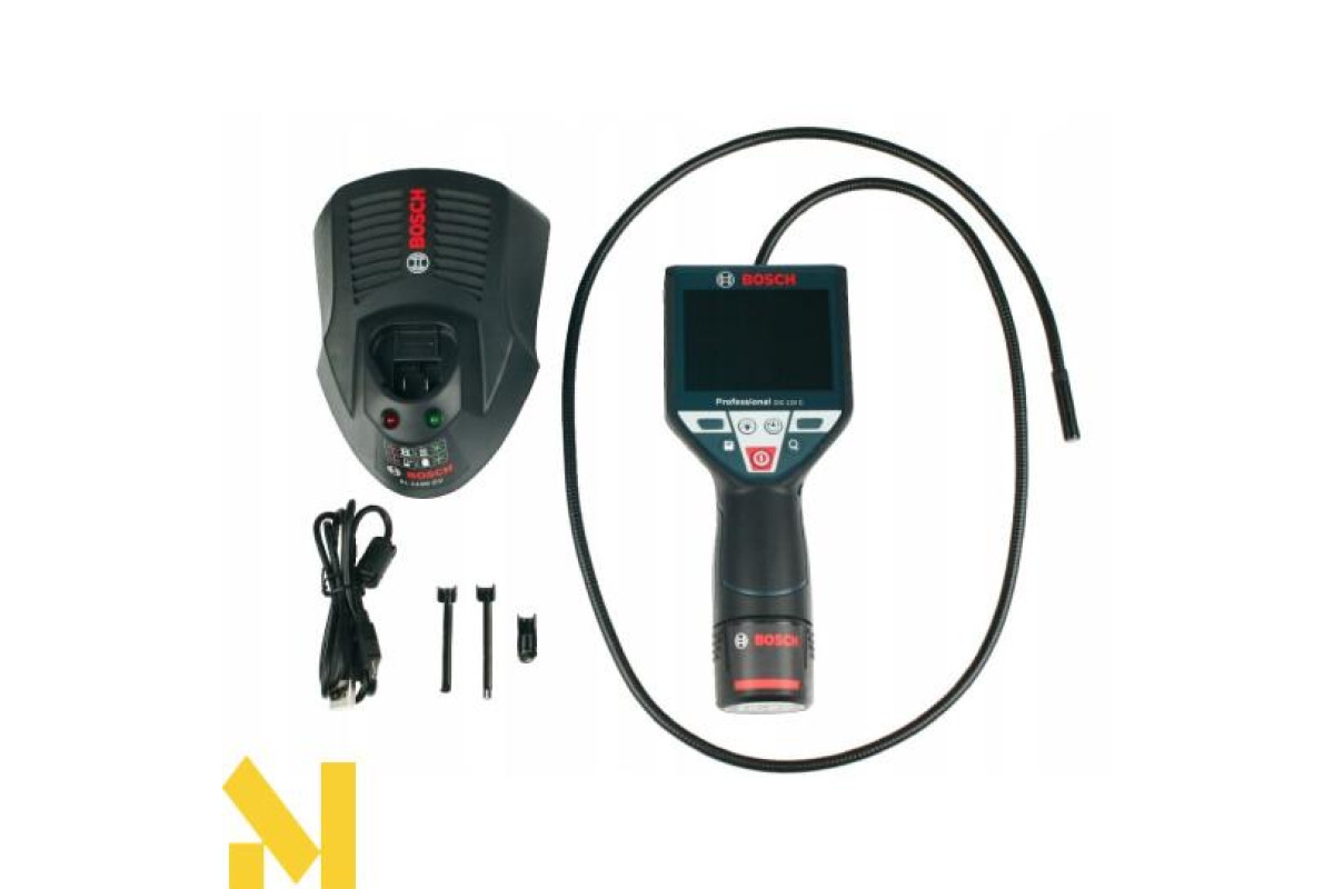 Зручна камера для огляду GIC 120 C BOSCH з гнучким важелем 120 см, який дозволяє дістатися до важкодоступних місць, наприклад прихованих частин двигуна, систем каналізації за стіною і тому подібного. Пристрій завдяки своєму універсальному застосуванню ідеально підходить для роботи будь-якої професії, яка має справу з важкодоступними місцями (механіки, інспектори, сантехніки, слюсарі, сантехнічні, опалювальні та вентиляційні установки). Пристрій забезпечує чудову якість зображення завдяки високій роздільній здатності (320 x 240 пікселів) і реалістичним кольорам, які дозволяють розпізнавати найдрібніші деталі, представлені на 3,5-дюймовому РК-екрані. Ніякого бруду не прилипає до гладкої поверхні головки камери, тому навіть в запилених умовах видимість не погіршується. Велика глибина різкості (від 3,8 см до нескінченності) забезпечує оптимальну видимість об'єкта, в той час як діод Power LED, розміщений на голівці камери, рівномірно і інтенсивно висвітлює темні кути. Можна встановити 3 рівня яскравості діода, адаптовані до конкретної ситуації. Крім того, камера оснащена новітні системи захисту від перевантажень - електронна система захисту ECP і система управління тепловою енергією.