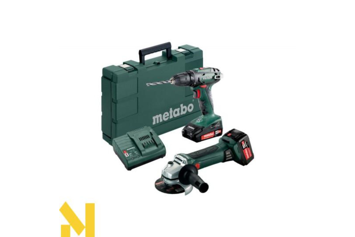 Комплект інструменту Metabo Combo 2.4.3 18 V складається з акумуляторного шуруповерта Metabo BS 18, акумуляторної болгарки Metabo W 18 LTX 125 і двох акумуляторів Li-Power 18 В 2,0 Ач і 4,0 Ач із зарядним пристроєм.