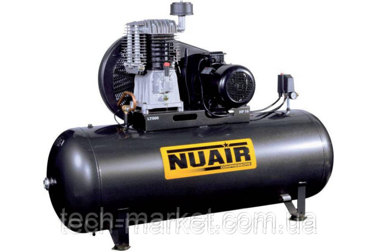 Компресор NUAIR NB7/7,5CT/500 обладнаний тихим двоциліндровим потужним двигуном потужністю 7,5 к. с. Обсяг ресивера 500 л. Використовується для великих автомобільних сервісних станцій і виробничих майданчиків під час проведення фарбувальних, ремонтних, продувних робіт, чудово справляється з накачуванням автомобільних шин, камер. Гільза циліндра виготовлена з високоякісного чавуну. Завдяки пластинам клапанів із неіржавкої сталі продуктивність досягає 840 л/хв. Для ефективнішої роботи в NUAIR NB7/7,5CT/500 збільшений оливний картер. Компресор обладнаний алюмінієвими головками циліндрів з охолоджувальними ребрами, які вбережуть двигун від перегрівання, і регулятором тиску. Інструменти вбудовані в конструкцію бака, доступні для легкого використання й захищені від пошкодження. Транспортувальні колеса та ручка забезпечать зручне переміщення компресора.