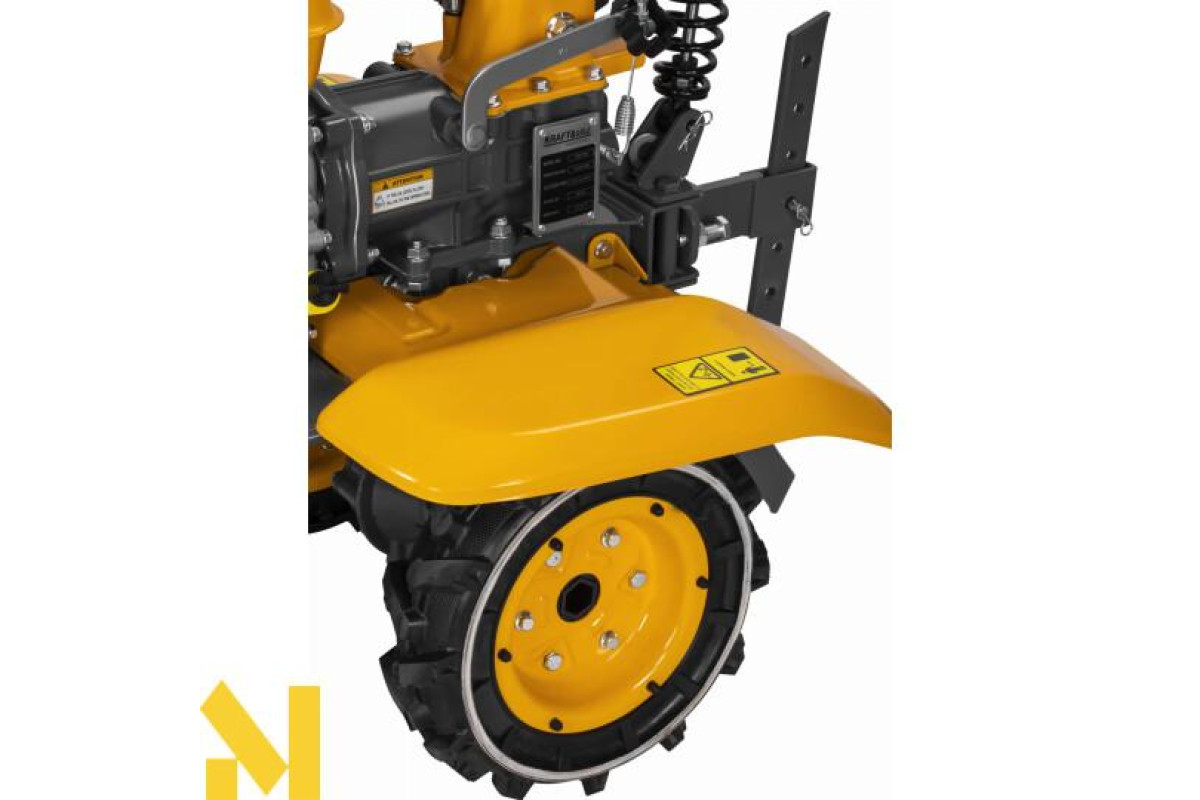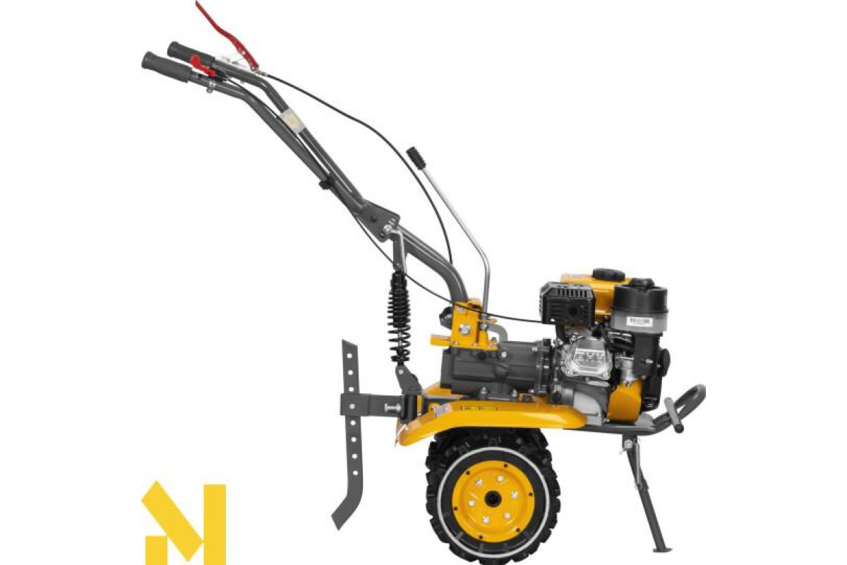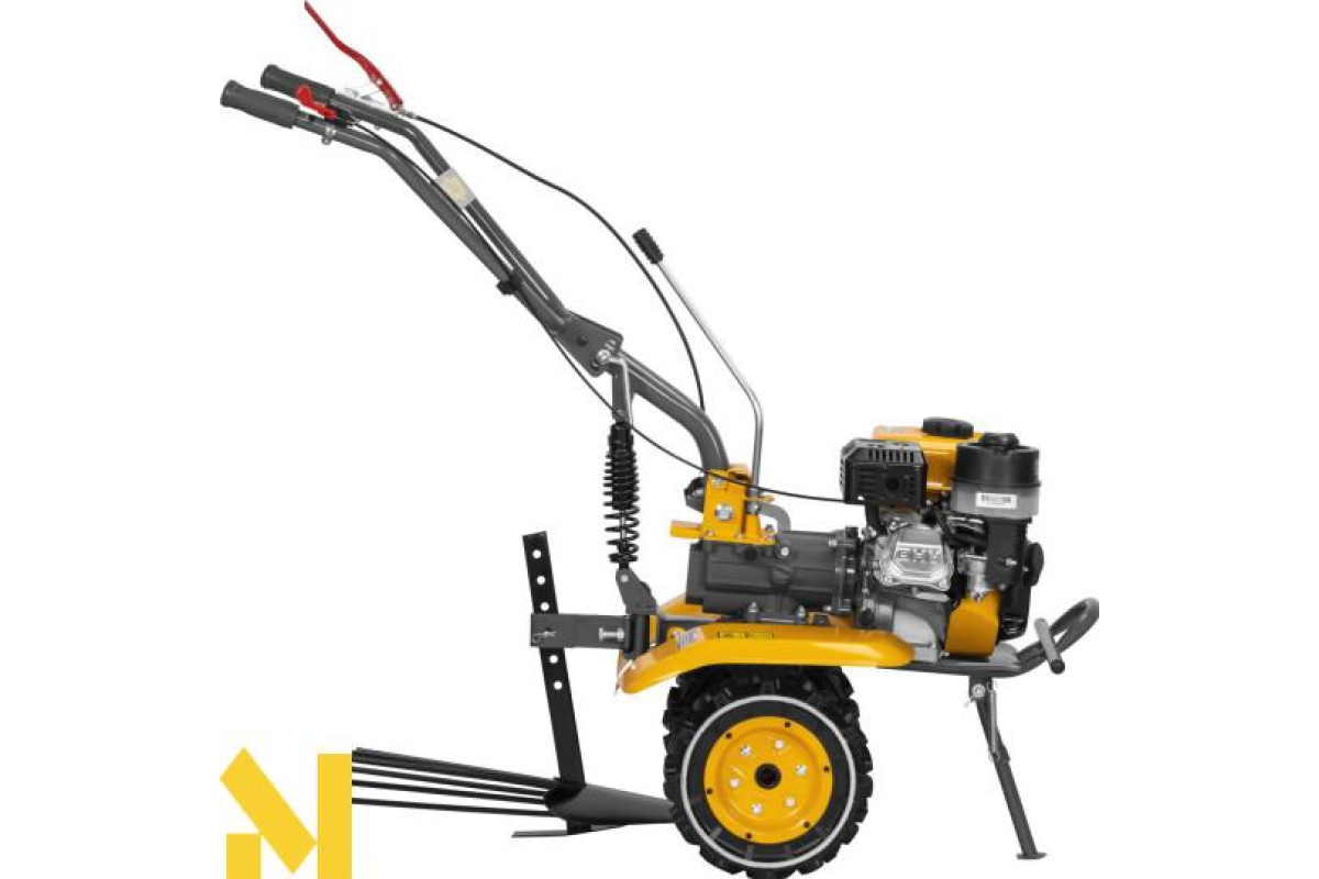 Машина оснащена чотиритактним двигуном, що працює з номінальною швидкістю 3600 об/хв, та зубчастою передачею, що забезпечує довговічність і стабільність роботи. Грунторозпушувач має дві передачі вперед, нейтральну передачу та задню передачу, що значно полегшує маневрування під час роботи в саду. Конструкція пристрою також включає крила, що захищають оператора від викиданої землі, металеві захисні диски, що захищають леза, та міцну раму з пружинною підвіскою, що покращує стабільність.
