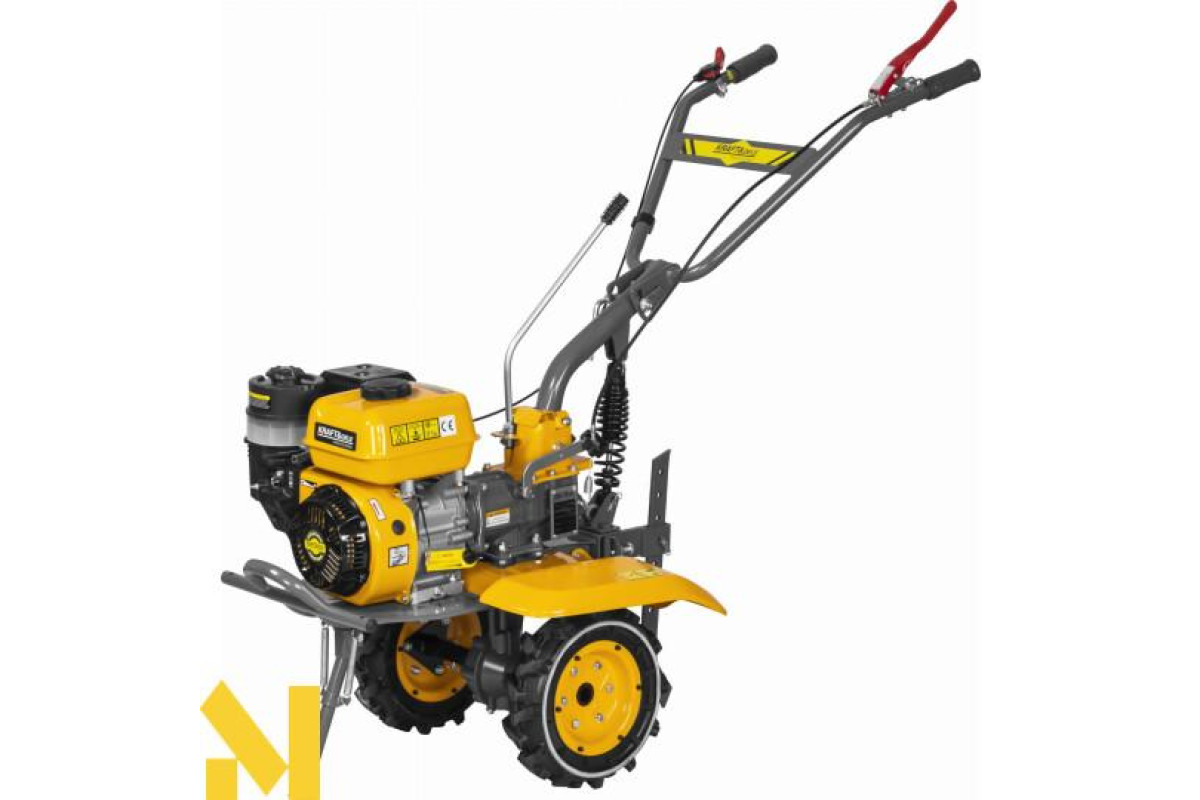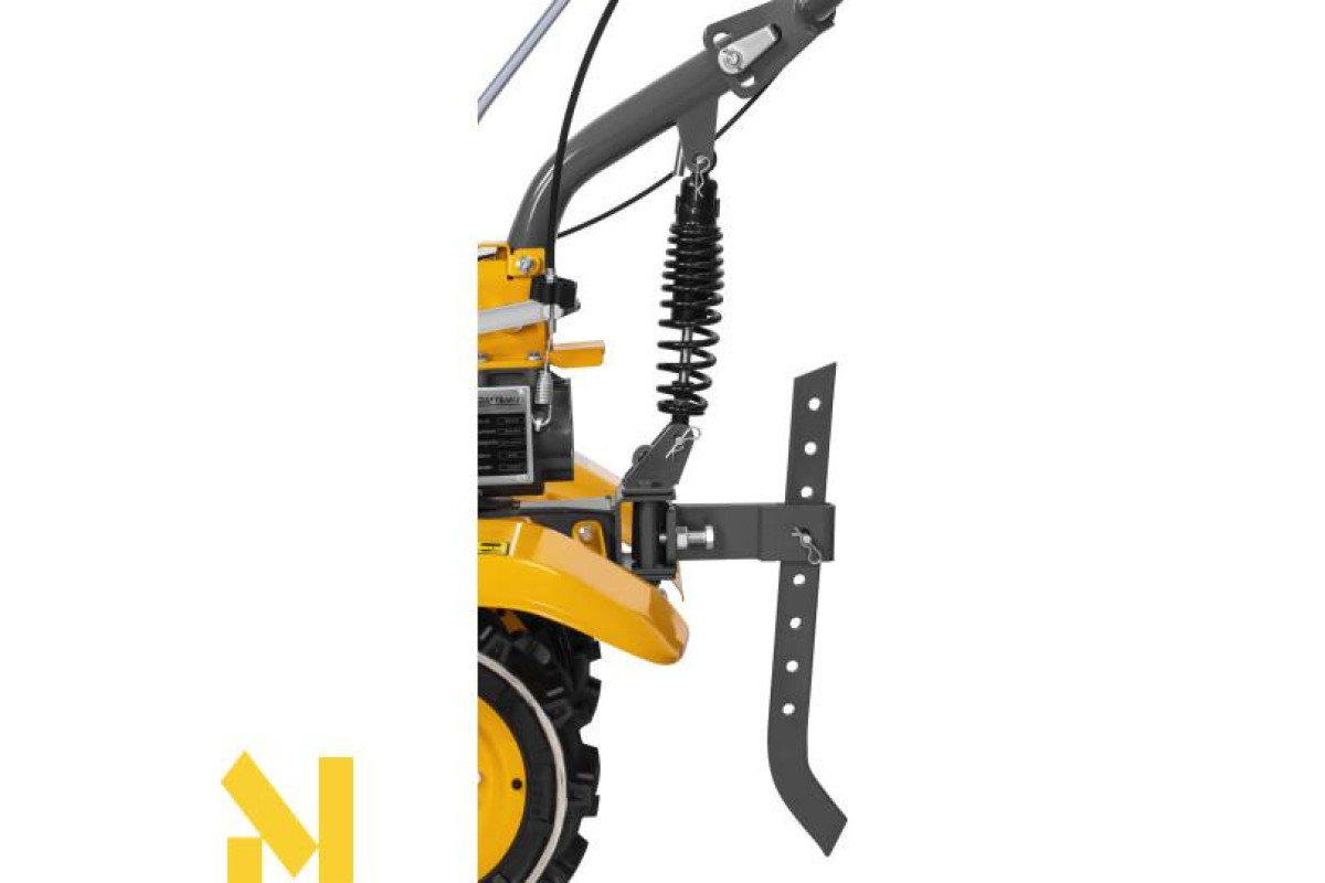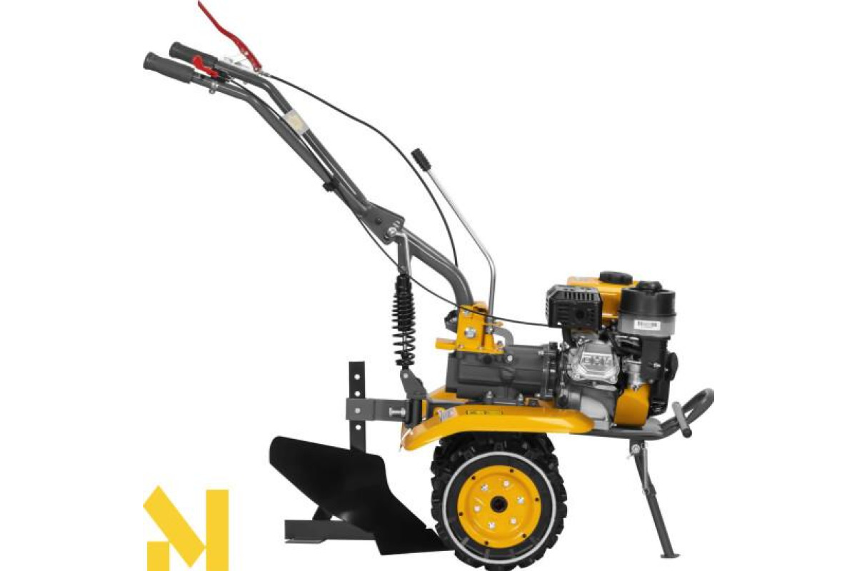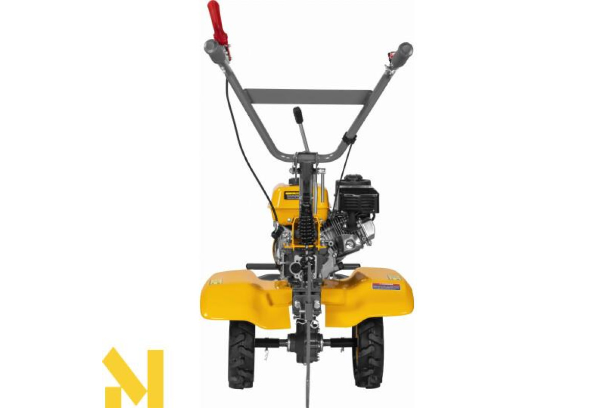 Машина оснащена чотиритактним двигуном, що працює з номінальною швидкістю 3600 об/хв, та зубчастою передачею, що забезпечує довговічність і стабільність роботи. Грунторозпушувач має дві передачі вперед, нейтральну передачу та задню передачу, що значно полегшує маневрування під час роботи в саду. Конструкція пристрою також включає крила, що захищають оператора від викиданої землі, металеві захисні диски, що захищають леза, та міцну раму з пружинною підвіскою, що покращує стабільність.