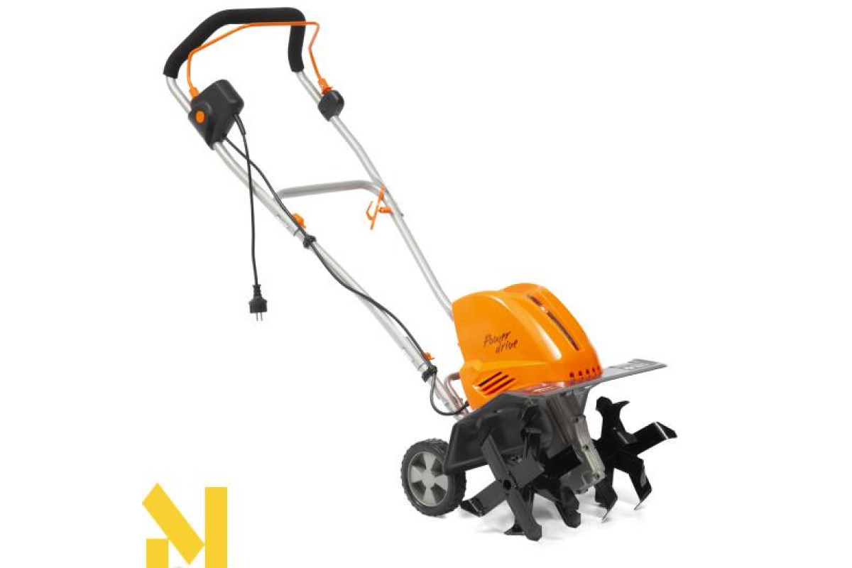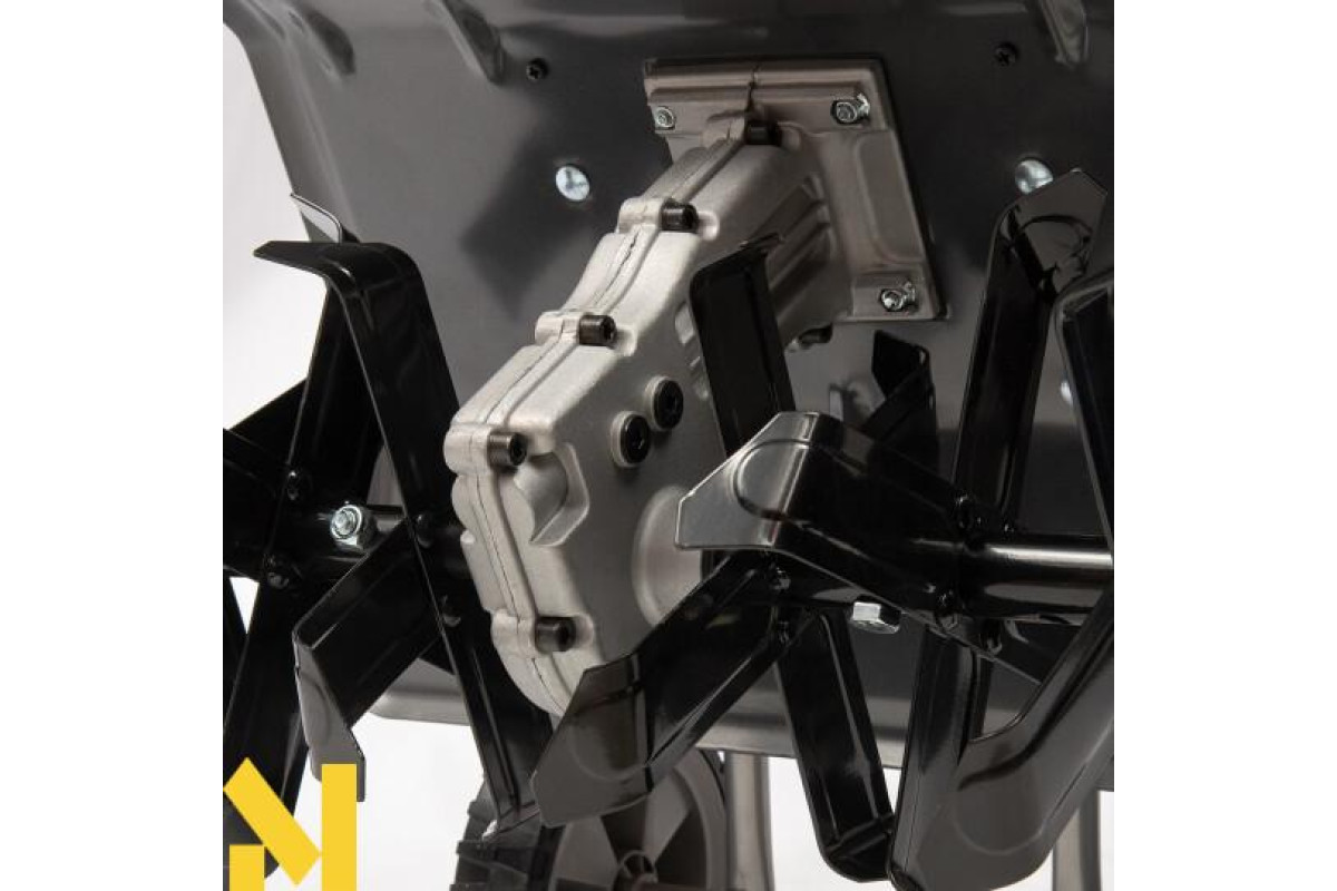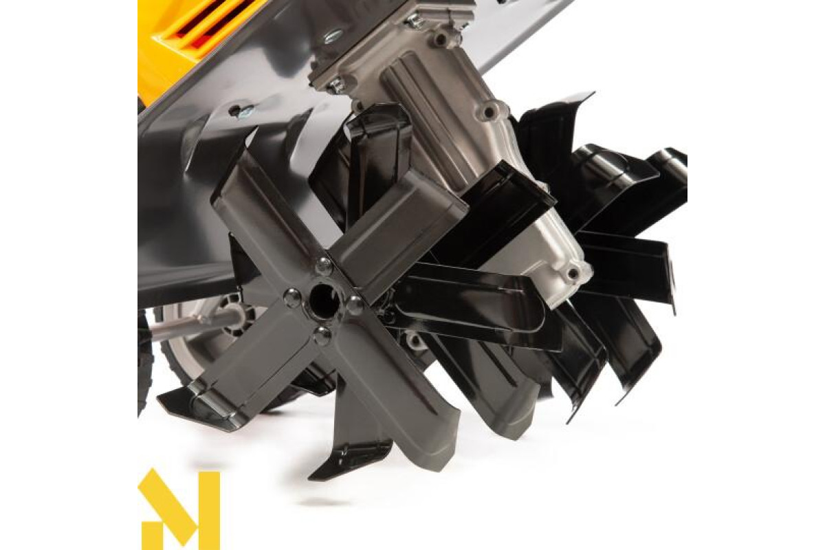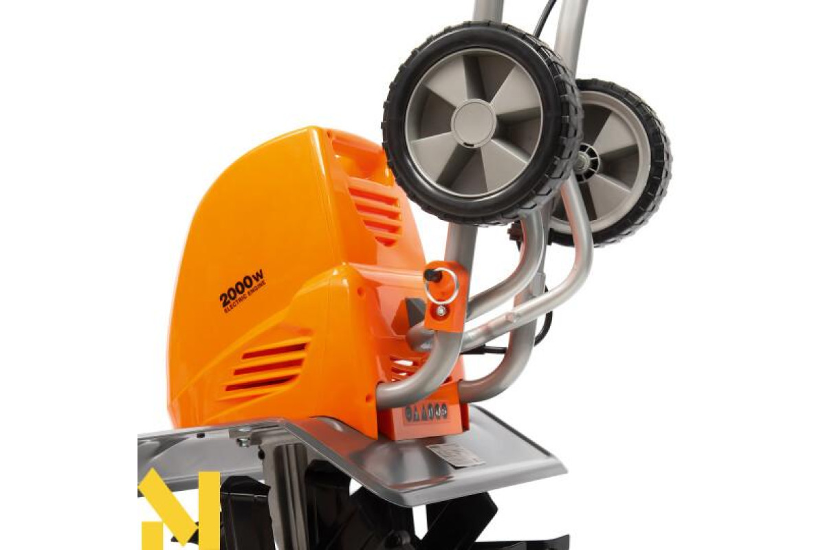 Також культиватор обладнаний 6 фрезами особливої форми, вони повністю зариваються в грунт і допомагають пристрою просуватися вперед. Для зручного переміщення передбачені транспортувальні колеса.