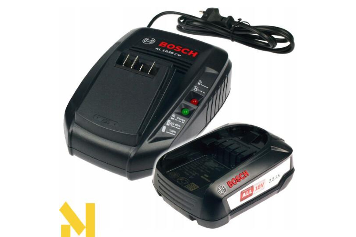 Ми пропонуємо ліхтар з акумулятором PBA 18V ємністю 2,5Ач та цифровим зарядним пристроєм AL 1830 CV від BOSCH.