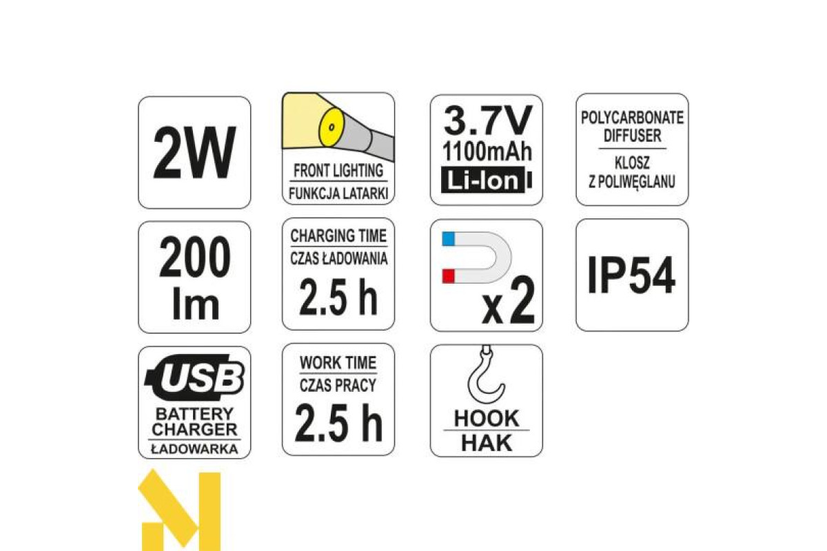 Основне світло: 2 Вт COB LED, 200 лм, 80 CRI, час роботи 2.5 год