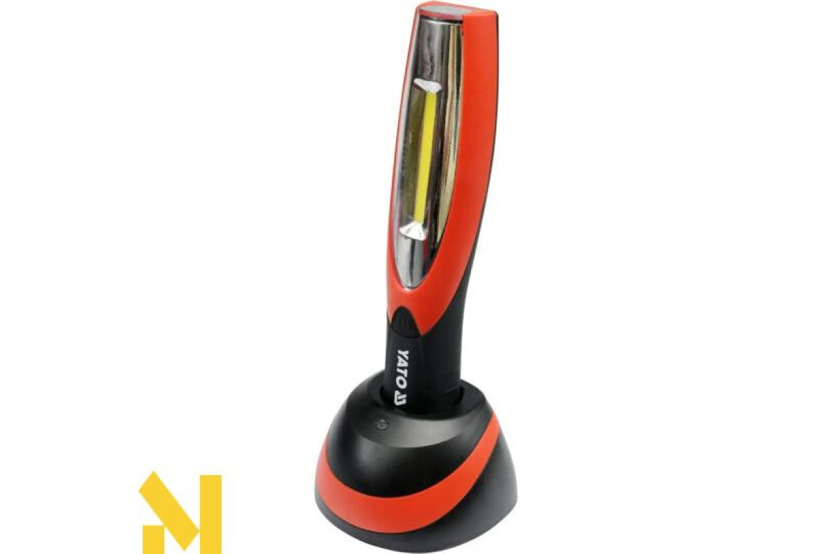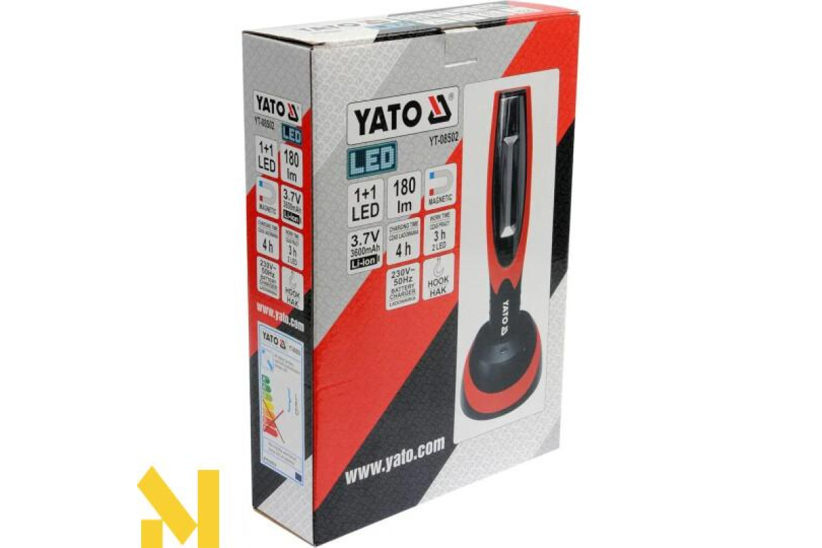 Yato YT-08502 - акумуляторний ліхтар c 2 режимами роботи і світлодіодами з ресурсом більше 30000 годин. Модель має окрему підставку для зарядки і два шнура живлення на 220 вольт і від прикурювача автомобіля.