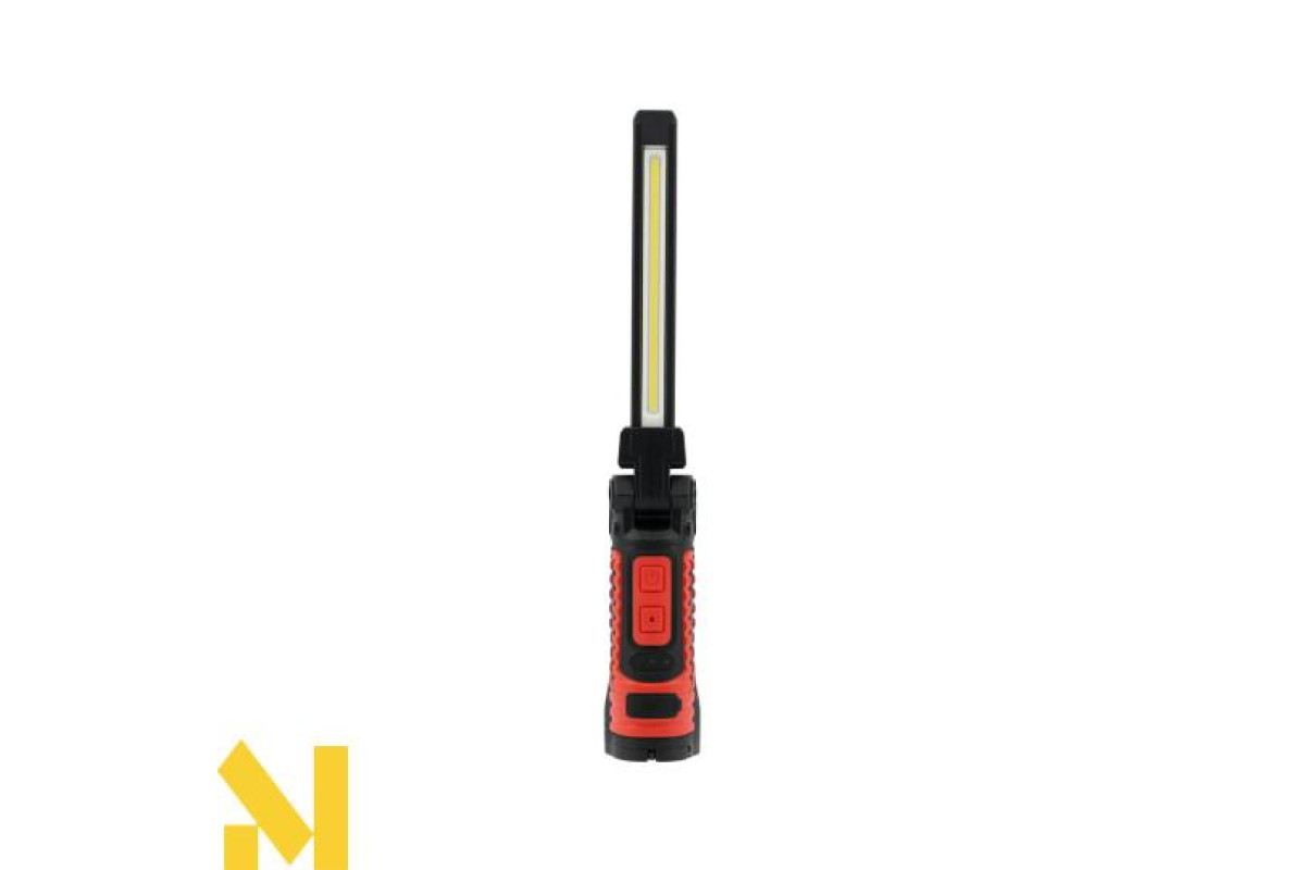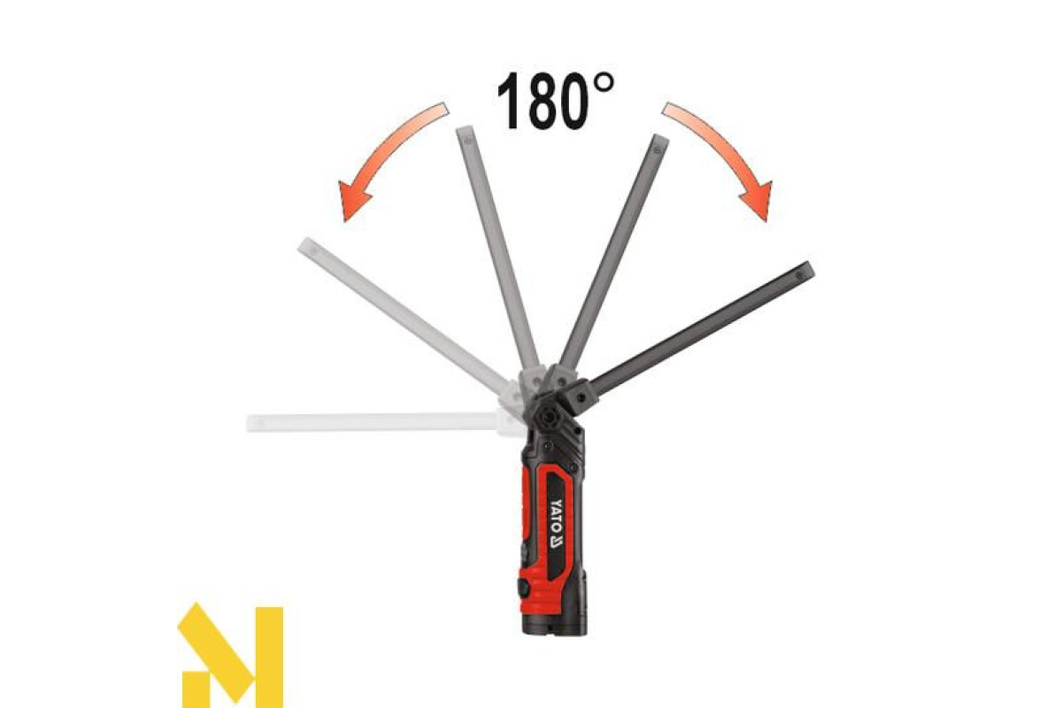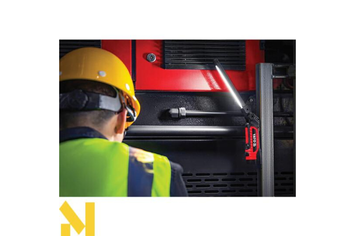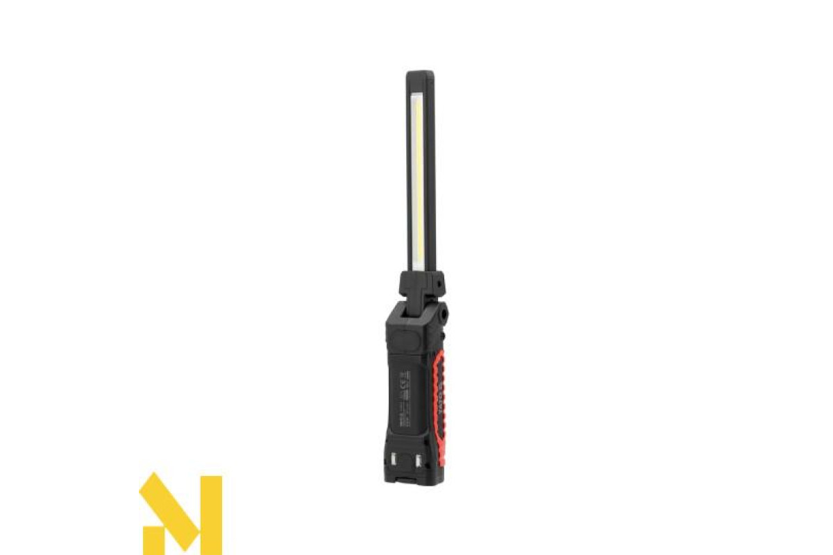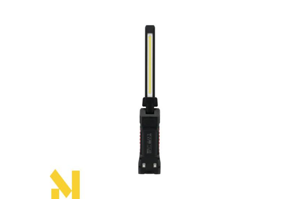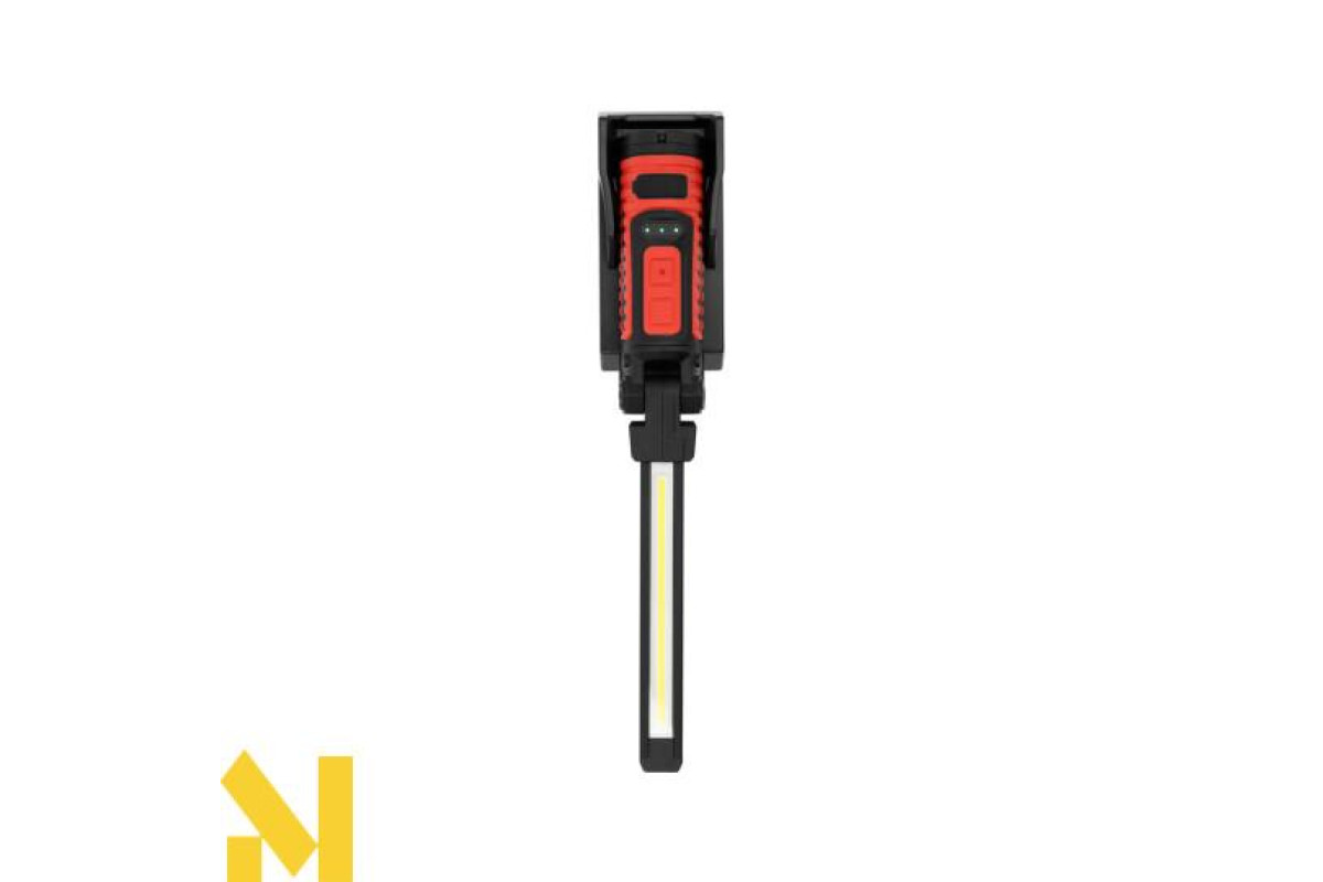 Цей акумуляторний ліхтар для майстерні із зарядною станцією – це мобільний інспекційний ліхтар, призначений для роботи поблизу заготовки. Вузька, видовжена конструкція дозволяє вставляти ліхтар між конструктивними елементами, а регульований шарнір 55° + 125° забезпечує точне регулювання напрямку світла без необхідності переміщення всього пристрою. Це рішення полегшує огляд поверхонь, з'єднань та монтажних компонентів у обмеженому просторі.