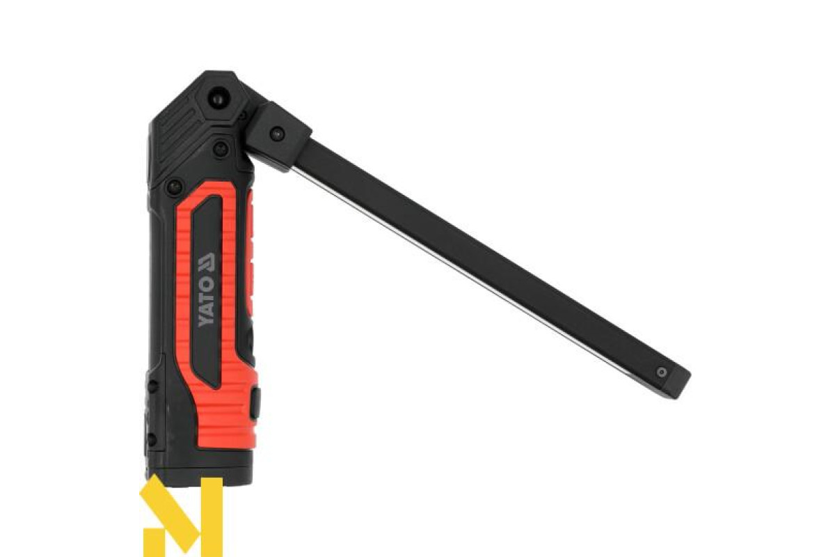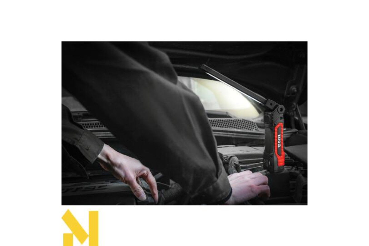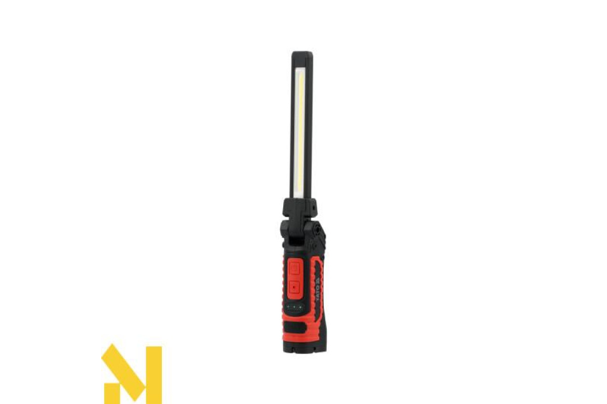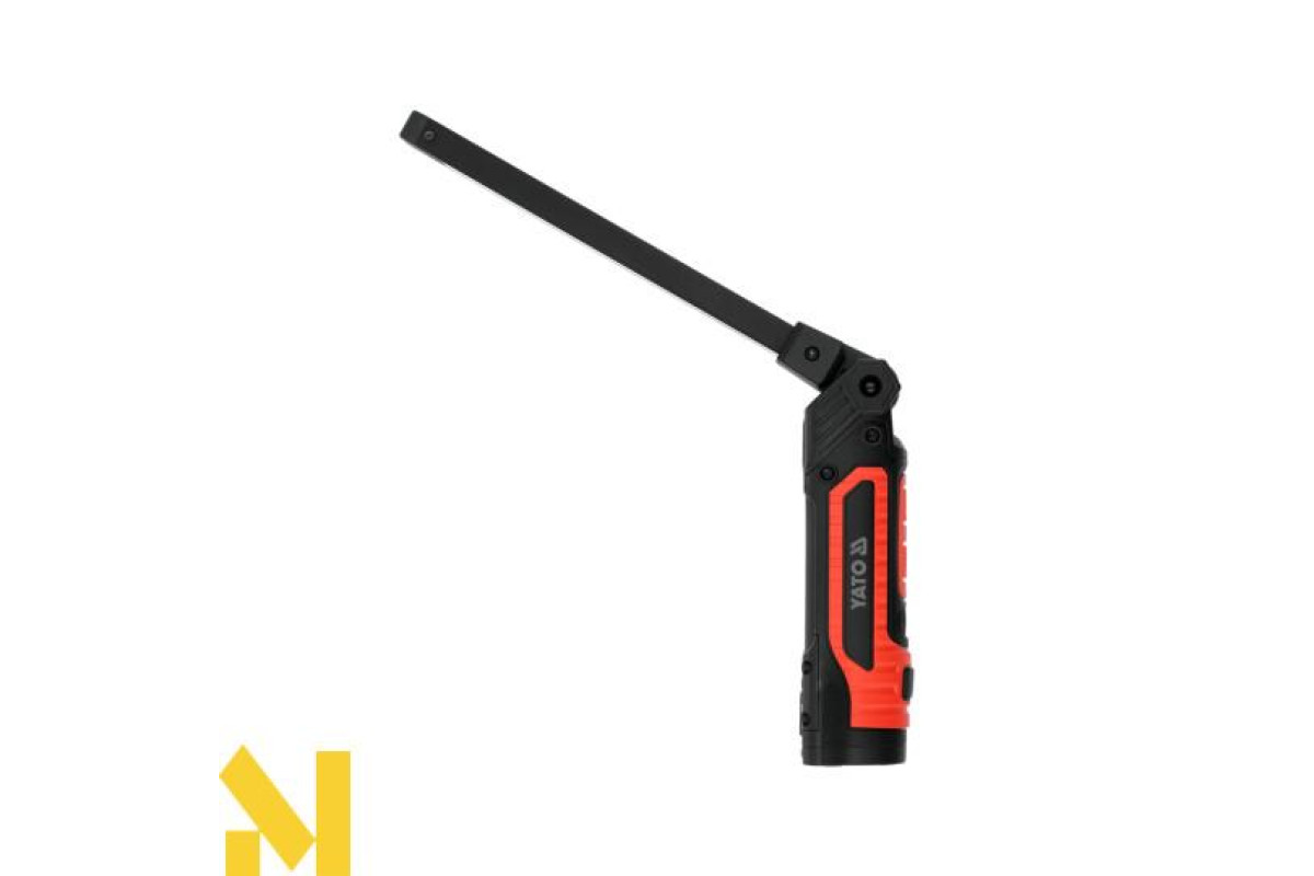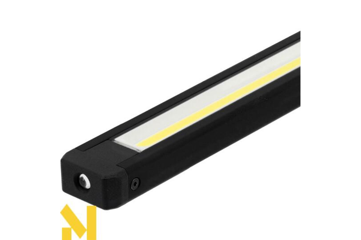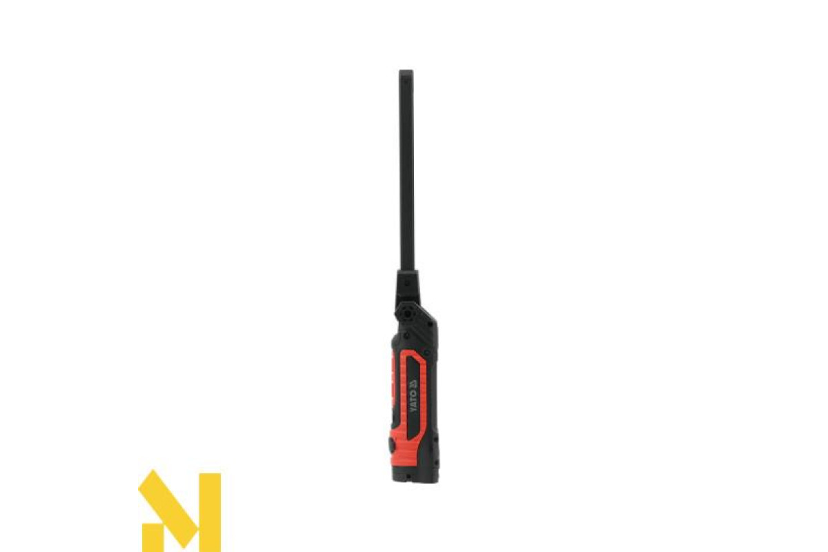 Цей акумуляторний ліхтар для майстерні із зарядною станцією – це мобільний інспекційний ліхтар, призначений для роботи поблизу заготовки. Вузька, видовжена конструкція дозволяє вставляти ліхтар між конструктивними елементами, а регульований шарнір 55° + 125° забезпечує точне регулювання напрямку світла без необхідності переміщення всього пристрою. Це рішення полегшує огляд поверхонь, з'єднань та монтажних компонентів у обмеженому просторі.