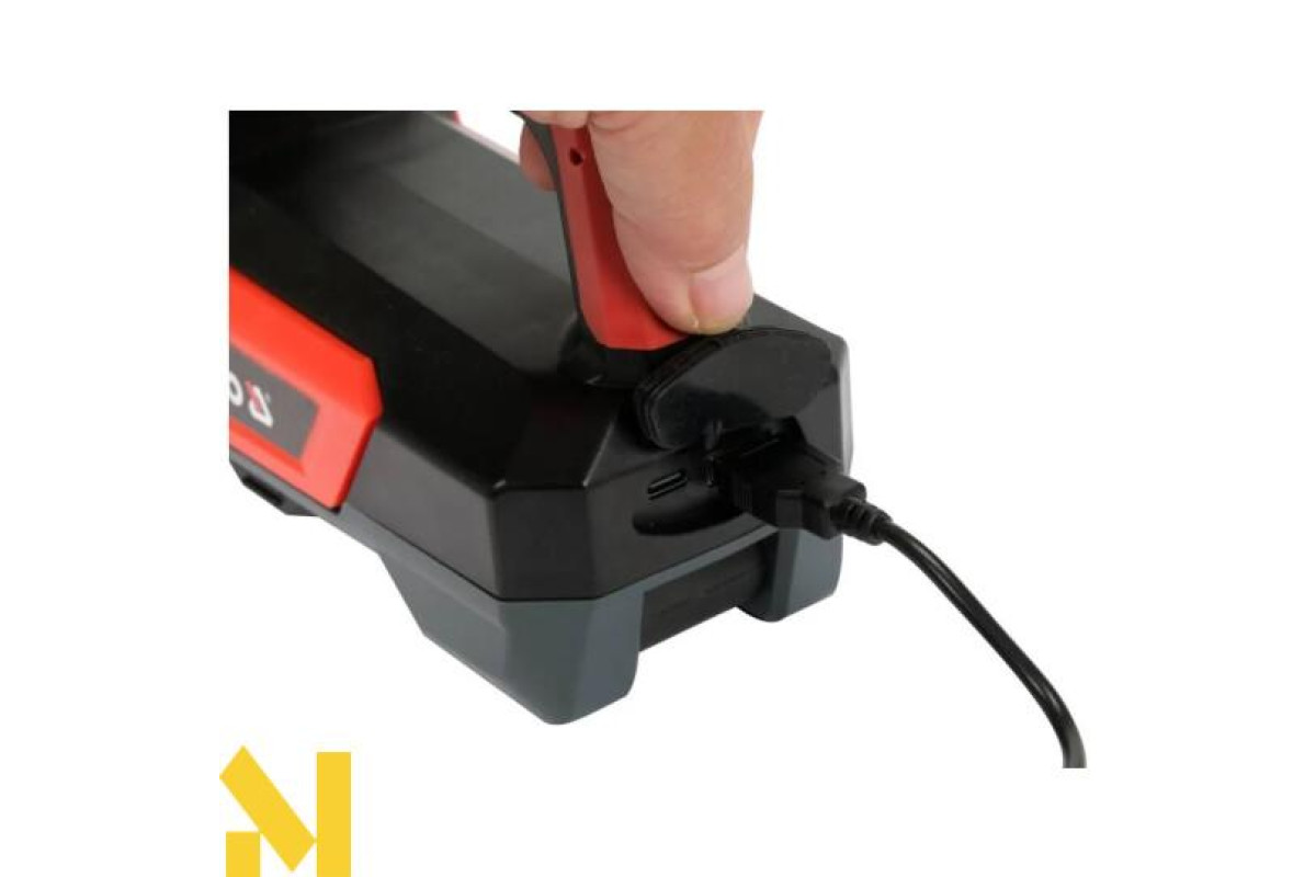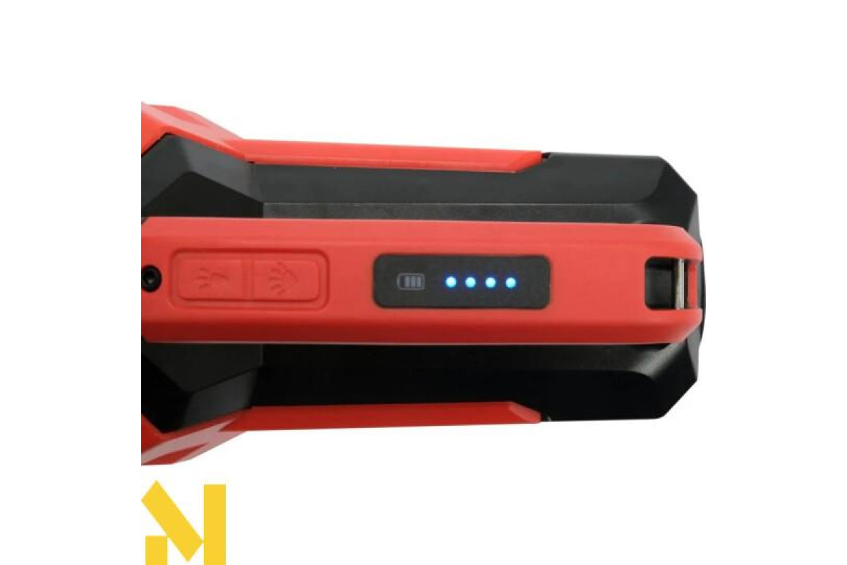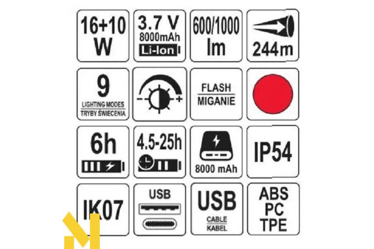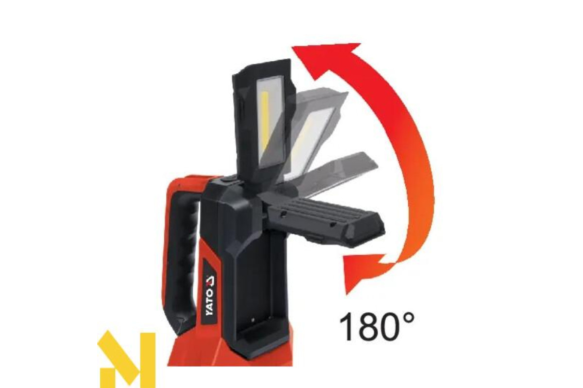Ліхтар YATO YT-08548, що поєднує функції спрямованого прожектора та регульованого прожектора, основою якого є корпус ліхтаря. Дальність прожектора: 244 м. Прожектор світиться світлодіодом потужністю 600 лм, а прожектор - світлодіодом COB потужністю 1000 лм. Ліхтарик живиться від вбудованого акумулятора ємністю 8000 мАг, який також можна використовувати як блок живлення. У ручці є 4-ступінчастий індикатор заряду акумулятора.