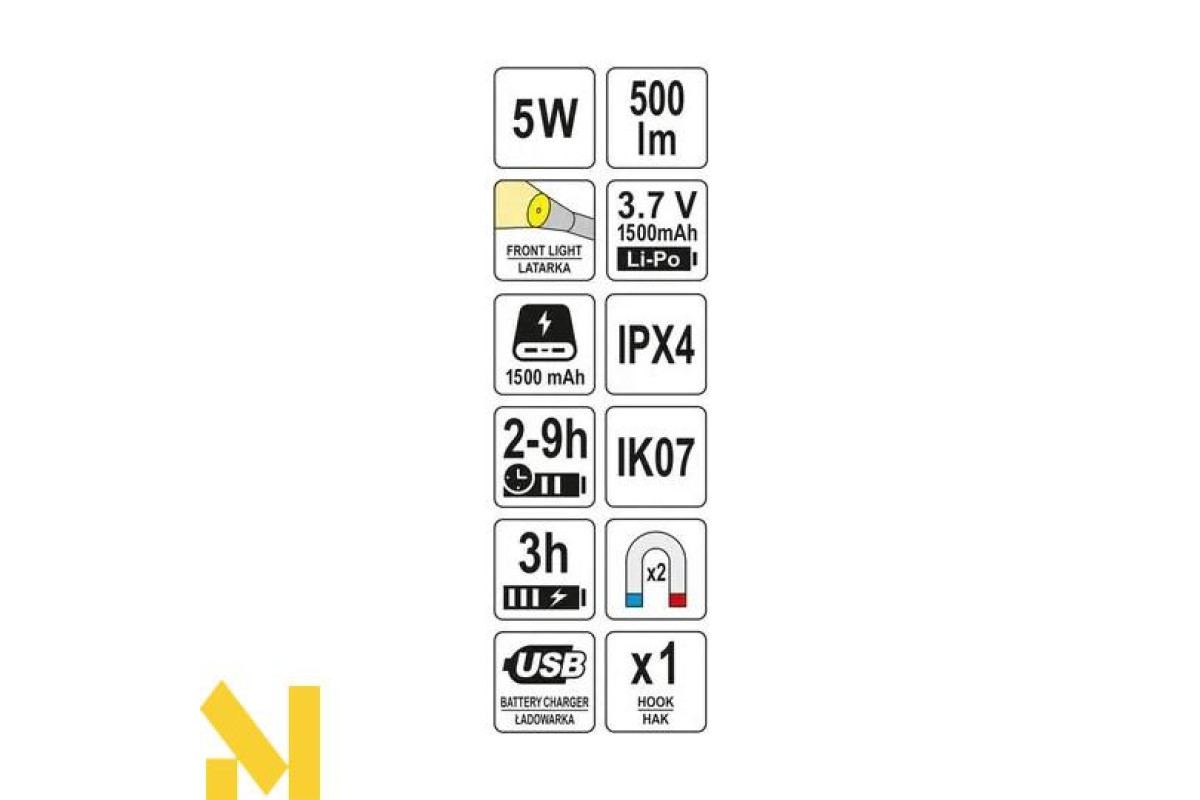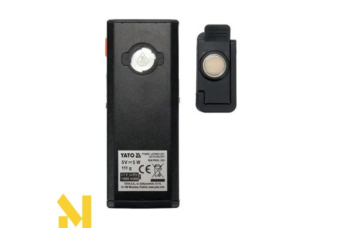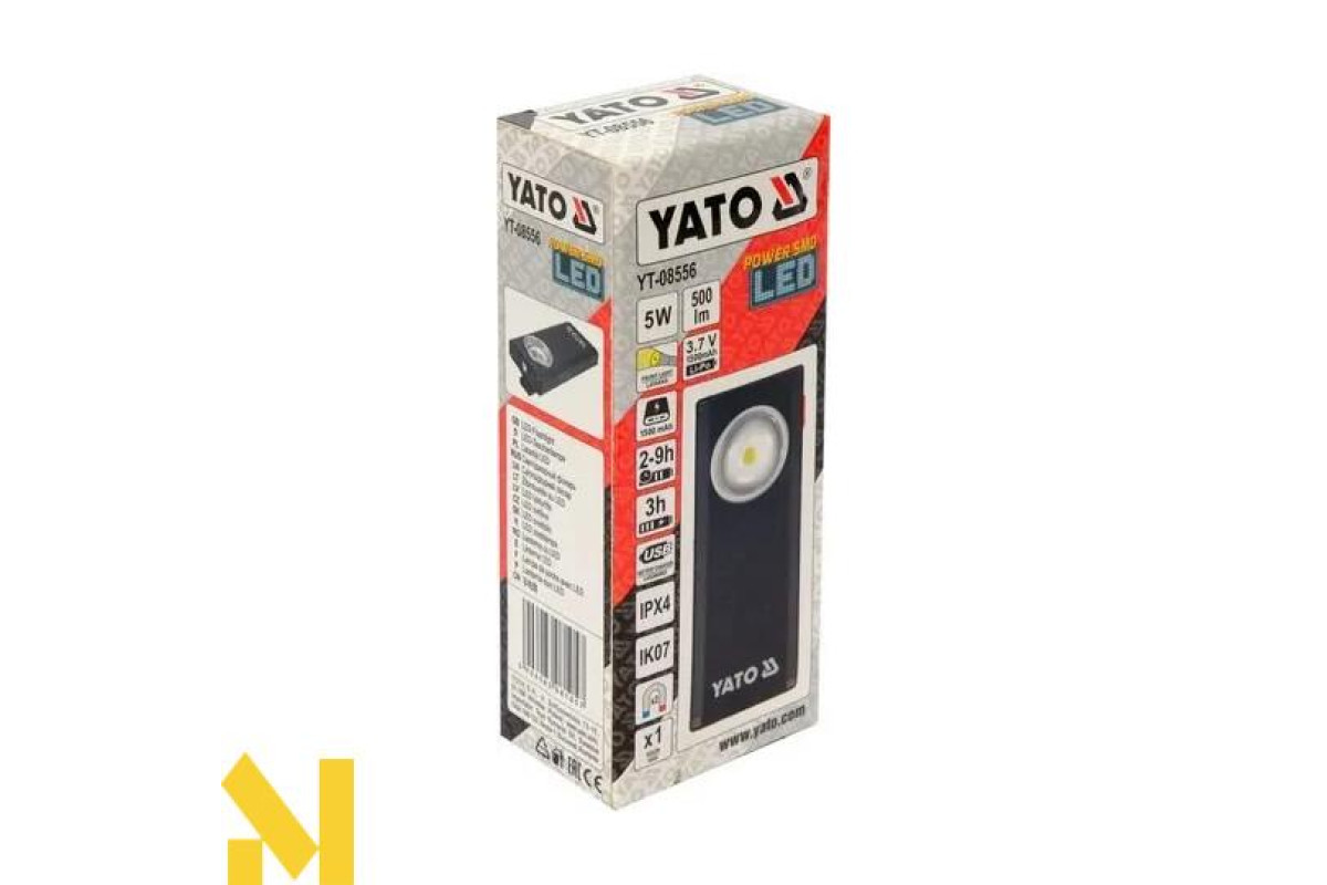 Міцний алюмінієвий ліхтар Yato YT-08556 оснащений діодом Osram, який забезпечує світловий потік 500 лм та дальність дії 55 м. Три режими роботи дозволяють регулювати освітлення залежно від активності та рівня заряду акумулятора. Оснащений літій-полімерним акумулятором 3,7В 1500мАч, забезпечує до 9 годин роботи та дозволяє заряджати інші пристрої – функція powerbank. Додатковою перевагою є можливість підвішування ліхтаря у різний спосіб - на магніті, кліпсі або гачку.