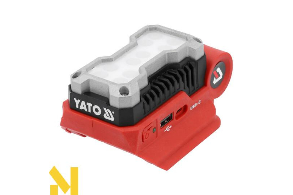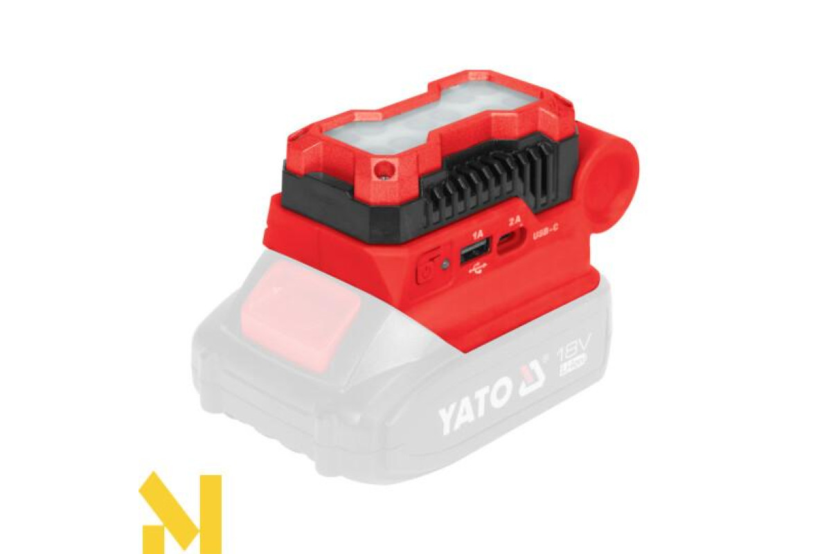 Функція зовнішнього зарядного пристрою з двома портами: порт USB Type-C (2 A), порт USB (1 A) та порт для заряджання акумулятора YATO від мережі (2 A, з круглим штекером 6,4 x 3,0 мм з контактним штекером)